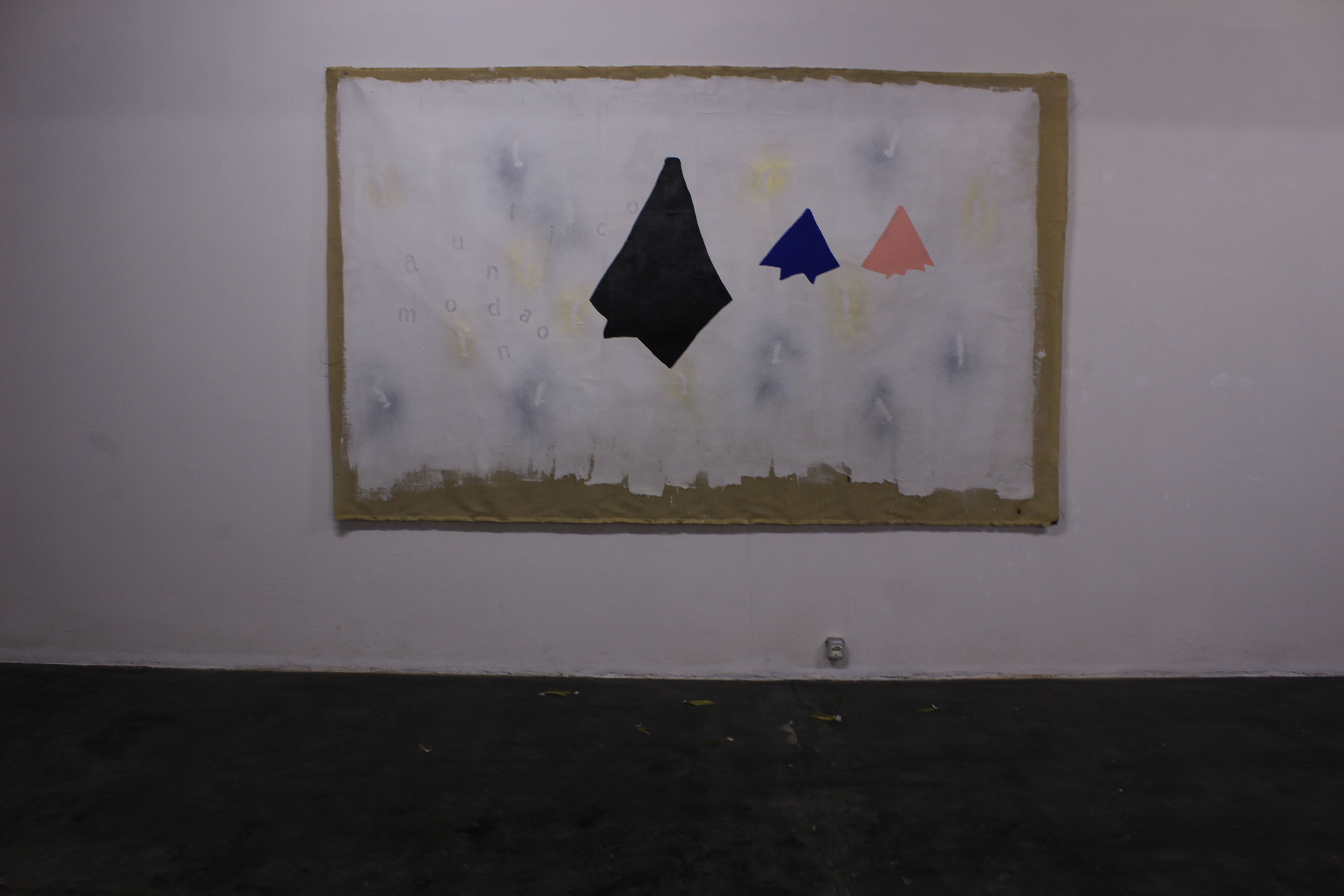 La stessa figura è infatti anche il soggetto dell’unica tela esposta, in cui volteggiano le lettere che compongono le due parole “aulico” e “mondano”, quelle due sfere della socialità che non stiamo più vivendo ma a cui continuiamo ad aspirare.