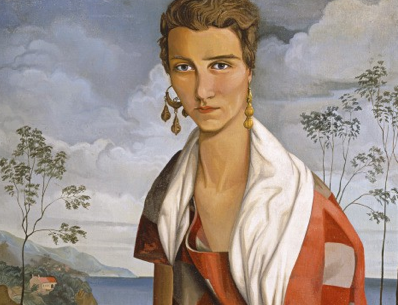 A proposito d’orecchi: Alfred Courmes ritrasse Peggy Guggenheim con due orecchini diversi che forse erano quelli di Tanguy e di Calder, come leggenda vuole, per dimostrare imparzialità nella selezione. Indossa una maglia a maniche corte con una fantasia a scacchi sui toni del rosso, dell’arancio e del bianco, e compare seduta difronte a una baia rocciosa dove sta parcheggiata una cabriolet alla moda. Sembra seria e composta, anche se fra le nuvole finisce la sua testa.