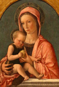 Ave Maria piena di grazia e piena di cose, alle quali vieni associata con piacere. Che sei dipinta su così tante tele o tavole che in effetti è meglio poter distinguere e nominarti diversa quasi ogni volta, pregandoti di aver pazienza. Madonna della Mela è quella del Bellini, ed è ovvio che il bambino regge in mano il frutto simbolo del peccato. Maria non lo guarda e sembra quasi volerglielo sottrarre, come se servisse a scongiurare la prevista tragica sorte.