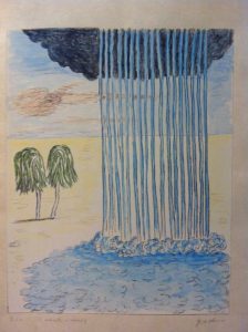 E allora a salvarci potrebbe intervenire una litografia di De Chirico: ci sono due alberi verdi, un paesaggio sabbioso, un nuvola nera da cui pare scendere pioggia come una fontana. E’ un’opera strana e metafisica, ma la morale è la medesima: quando fa caldo, bagnatevi spesso e cercate di stare al fresco. E pensate alla pioggia che nel 1889 si scagliò su Saint-Rémy-de-Provence e che impressionò a tal punto il paziente Vincent Van Gogh che la osservò dalla finestra dell’ospedale Saint-Paul e decise di immortalarla. Così a far da scudo all’immagine di quelle note terre, a quei campi verdi rinvigoriti dall’acqua, si frappongono infinite linee verticali e oblique, che scalfiscono come dei graffi e regalano sensazioni forti.