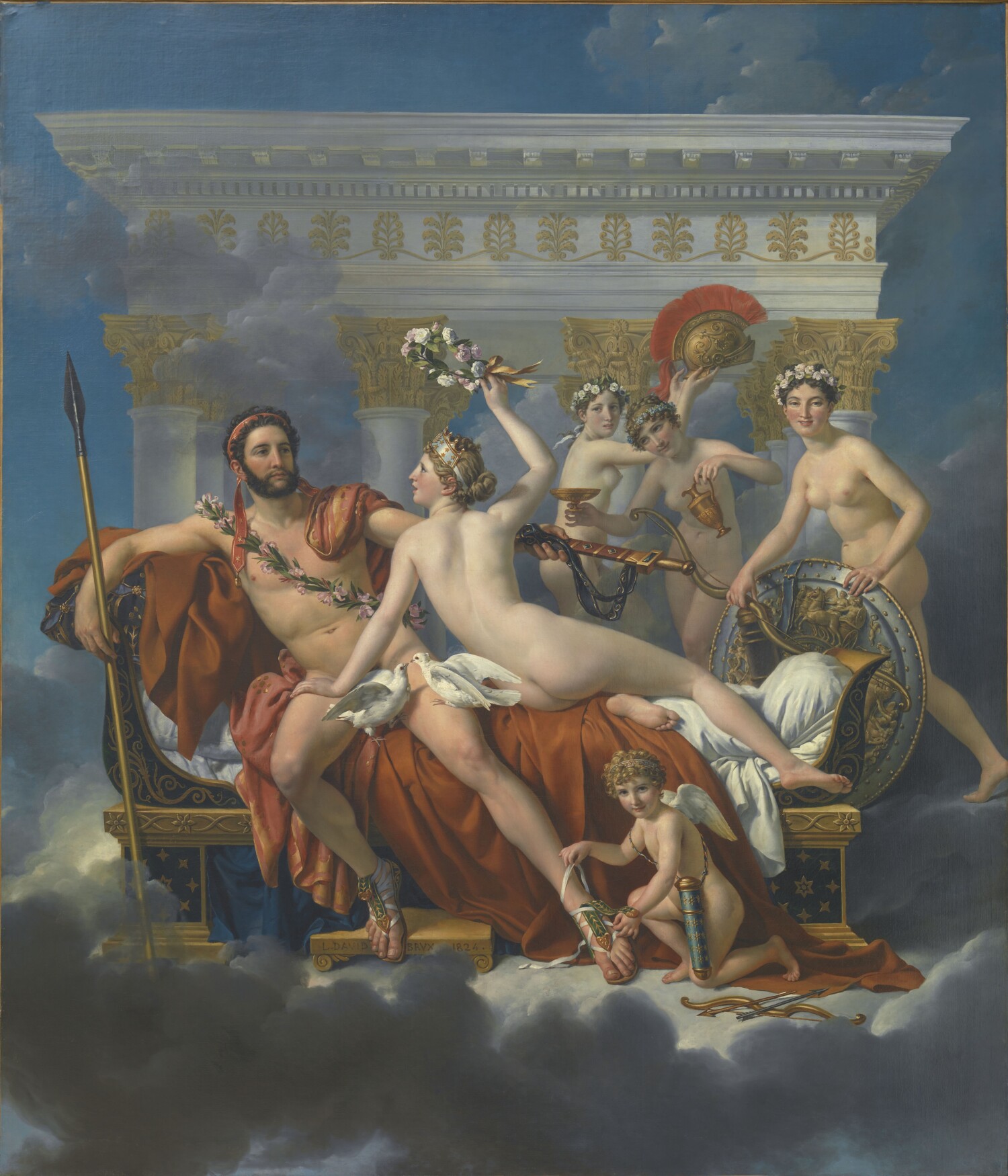 La mostra si chiude con un ritorno di David agli amori degli dei, con Venere che disarma Marte, nel quale il Dio della guerra cede le sue armi alla seduzione della dea. Dal punto di vista pittorico il quadro è splendido, l’invenzione delle nuvole stagliate contro un azzurro siderale, il corpo del Dio accarezzato da una luce che ne mette in risalto il gioco dei muscoli, la Venere di spalle, simile a un’odalisca (e qui avranno fischiato le orecchie a Ingres), l’affaccendarsi di ninfe ed eroti attorno ai due amanti, il tutto sullo sfondo, un po’ incongruo, del colonnato di un tempio. David gioca alla rievocazione di un tempo gioioso, ormai perduto per sempre.