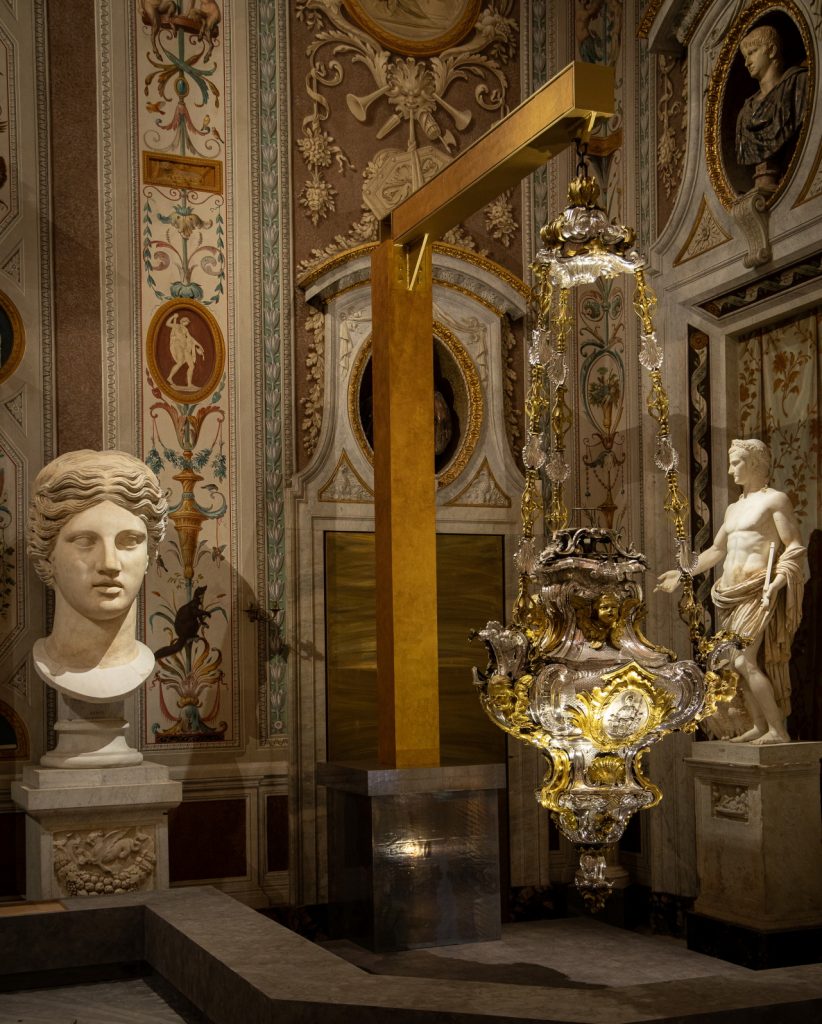 La mostra si apre col suggestivo salone d’ingresso, affrescato da Mariano Rossi, al cui interno sono esposte opere che testimoniano la grande varietà di committenze che caratterizzò il lavoro di Valadier. Si va dalla magnifica lampada ad olio realizzata per la Cappella Maggiore del Santuario di Santiago de Compostela, fino alle raffinate copie in bronzo di statue antiche, come l’Antinoo Capitolino del Louvre, eseguito per una committenza privata. Sacro o profano poco importa, la costante del lavoro di Valadier fu sempre la ricerca del gusto, nella sua continua evoluzione, inseguendo e spesso anticipando il cambiamento degli stili e delle mode.