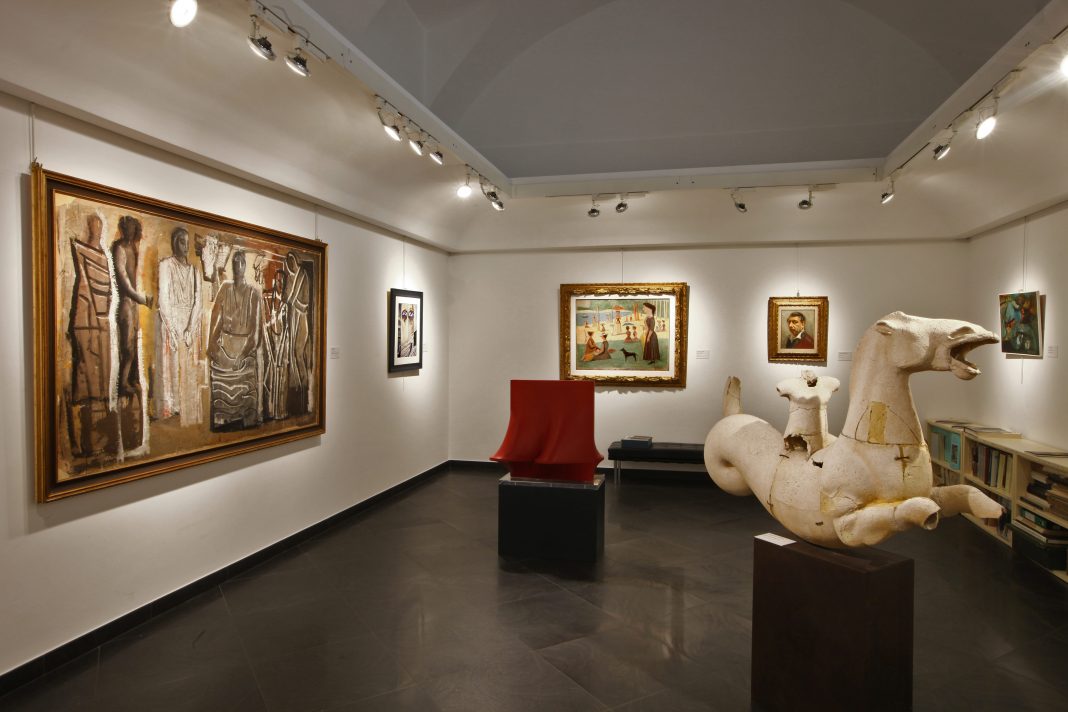 «Il percorso espositivo si articola nei due spazi della galleria nel cortile del civico 45. Tale percorso non risponde a un preciso criterio tematico o cronologico, ma vuole rappresentare un pubblico e libero dialogo, tra due raccolte di opere appena uscite dal chiuso delle stanze private e presentate in una nuova cornice. Un dialogo che attraversa il nostro territorio culturale dal post-impressionismo alle avanguardie d’inizio secolo (il Futurismo di Marinetti, Boccioni, Balla, Severini), gli anni del primo conflitto mondiale, il dopoguerra e gli anni Venti (Savinio, de Chirico, de Pisis, Sironi, Casorati, Alberto Martini, Marini), l’affermazione del regime fascista e la seconda guerra mondiale (Carrà, Campigli, Arturo Martini, Prampolini, Pirandello, Guttuso, Manzù), il post-war tra le capitali europee e New York con l’affermazione dell’arte astratta (Fontana, Burri, Capogrossi, Vedova, Pomodoro)».