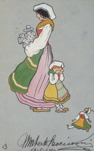Ma sono i primi passi mossi da Boccioni nell’arte che suscitano forse la maggiore attenzione, con il primo nucleo di opere d’impronta scolastica risalente al periodo in cui fu allievo di Giacomo Balla e frequentò le scuole di disegno pittorico e di nudo a Roma, a cui si affianca anche quello più copioso e diversificato, riconducibile agli anni immediatamente successivi, nei quali il tratto acquista sicurezza offrendo precise visioni architettoniche, ritratti curiosi (alcuni dei quali sembrano quasi caricature) e figure umane di estrema sintesi formale. Nel loro insieme, questi fogli documentano un tirocinio di studio insistito e articolato, il cui fine è quello di acquisire una padronanza nella resa prospettica dei volumi, ma anche di fisionomie e di movenze – studiate o colte al volo – del corpo umano nello spazio: aspetti comuni allora a molti artisti della modernità.