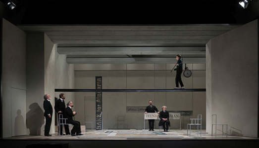 Non c’è sipario, la scena di Marco Rossi è già interamente visibile non appena si entra in sala. Bianca, pulita ed estremamente rigorosa. Quasi algida e distaccata. Una scatola senza tempo e senza filtri, così come gli abiti degli attori: non ci sono distrazioni, tutto quello che conta è la loro parola, che incanta e ipnotizza. La messinscena si oggettiva in un eterno presente storico, perché siamo noi spettatori chiamati in causa a dare significato al passato e alle sue ripercussioni sul presente.