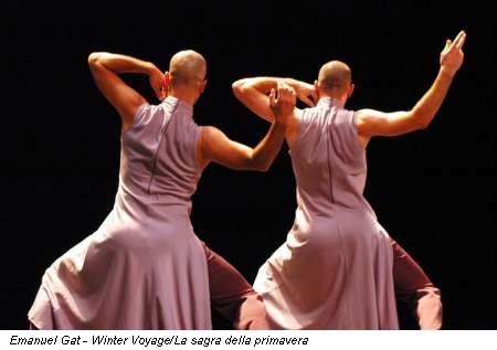 Chi invece su questa incoscienza del vivere -e su tutta la passionalità e la sensualità che si porta dietro- ha costruito il suo lavoro è Emanuel Gat. Il suo Winter Voyage/La sagra della primavera sembra voler dare un’idea panica delle forze psichiche che muovono l’essere umano e che lo spingono sia all’introversione, e quindi alla riflessione, sia all’estroversione, e quindi all’incontro supremo con l’altro. Qui troviamo un’altra particolarità biografica del coreografo israeliano: inizialmente aveva studiato per diventare direttore d’orchestra. Per certi versi, l’unico musicista del gruppo privo di strumenti, ma che deve farsi attraversare dalla musica corpo e anima, fibra per fibra, emozione per emozione, per restituire al suono la sua fisicità, strutturata ed espressiva. E questo spiega tutto. Spiega in particolare la rappresentazione proposta al Palladium, dove la prima parte, Winter Voyage, danzata sulle musiche dello Schubert del Winterreise, e in particolare dei lieder 5, 6 e 24, vede un palcoscenico rigorosamente spoglio e due soli ballerini, che si richiamano l’un l’altro i gesti e i passi, vestiti spartanamente con tuniche color grigio-argento. In questo apparente minimalismo c’è però tutta la possanza di una madre Terra dormiente sotto il velo di freddo e neve delle temperature invernali. E i danzatori, con i loro abiti svolazzanti, danno con precisione da naturalista navigato l’idea del sonnacchioso respiro del pianeta che si manifesta a momenti, con quelle folate di vento gelido che soffiano a volte rincorrendosi, a volte placandosi, creando giocosi mulinelli o cambiando improvvisamente direzione. Un paesaggio desolato e silenzioso, dove tutto è morto, ma solo nell’attesa di risorgere. Ed eccola, poi, la resurrezione, nella seconda parte dello spettacolo. La Sagra della primavera, sulle note dello splendido balletto musicato da Stravinsky, in questo caso totalmente rivisto e corretto. Qui ai due ballerini si aggiungono tre ballerine, di una fisicità eccessiva e plateale, e dove la mancanza di simmetria consente un equilibrio-squilibrio delle parti che bandisce la staticità e costringe i danzatori a un movimento continuo, a un prendere-e-lasciare che vede formarsi sempre nuove coppie. Ma questo continuo scambio conduce inevitabilmente a un conflitto e, come in una Cavalleria rusticana dalla pelle olivastra, si identifica senza troppa difficoltà la Lola della situazione. Tuttavia, qualsiasi sia l’epilogo della storia, non sembra comunque avere per Gat una valenza negativa. Come a dire: è pur sempre vita. E in questi intrecci funambolici, legati da passi di salsa che costruiscono delle scene al limite della perfezione, i movimenti dei cinque ballerini si stagliano come quadri d’autore su uno sfondo nero, inondati da una voluttuosa luce rossa.