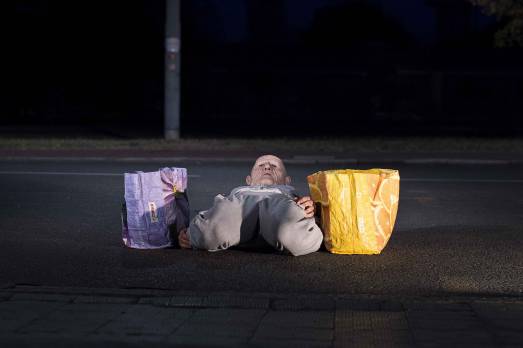 A peso morto di Carlo Massari. S’innesta di volta in volta in luoghi diversi, mutando effetto, la performance site-specific A peso morto di Carlo Massari, artista sensibile nel raccontare il nostro tempo assetato di umanità. La cerca il personaggio anonimo di una periferia senza tempo e identità. Indossa una inquietante maschera rugosa col volto di un anziano e avanza curvo con due borsoni da spesa in mano. Li lascia a terra, si guarda intorno, cerca altri sguardi, tende le braccia agli astanti, abbozza, da mendicante, qualche gesto di contatto che possa scaldare la sua mano. Una canzone e una musica popolare attivano in lui ricordi del tempo passato, pulsioni felici, memorie inscritte nel corpo che affiorano e lo muovono. Malinconico e sognante, tenero e ironico, vorrebbe ritrovare la stessa forza della giovane età, rivivere emozioni sopite. Ma il suo corpo, improvvisando balli e gesti, crollando e rialzandosi, risponde in maniera disarticolata, distorta, faticosa, stremante. Lo assalirà infine l’oblio, il vuoto fuori e dentro di sé, la cognizione del tempo fuggito, sentendosi comparsa passiva di un luogo che non gli appartiene. Togliendosi l’involucro della maschera e depositando a terra gli abiti, indietreggiando si distaccherà forse dalla sua stessa vita. Con A peso morto Massari fotografa una pietas contemporanea che arriva dritta al cuore.
