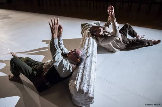 Sono invece corpi alquanto dissimili quelli dei due anziani che ora appaiono da una porta laterale portando sulle spalle una grande colonna antica, staccata, forse, da un tempio greco. Hanno orecchie puntute questi due fauni di oggi, corpi carichi di vissuto portando il peso della storia che li sovrasta. Sempre sulla musica di Debussy articolano gesti lenti, muti, delicati, appena accennati nell’aprire le braccia, tenderle in avanti o in alto, piegando stentatamente le gambe, mettendo una mano sulla spalla, sorreggendo ora l’uno ora l’altro la colonna, infine adagiandosi accanto ad essa deposta a terra, e addormentarsi. Lega mitologia e contemporaneità Virgilio Sieni in questo suo Prélude à l’aprés midi d’un faune, inedita versione della mitica figura ispirata al poema di Mallarmé e descritta dalla musica di Debussy, e riconducibile alla rivoluzionaria danza di Vaslav Nijinsky . “Gli interpreti, dissimili tra loro per età e capacità fisiche – spiega il coreografo –, amano ritrovarsi in questo cammino. …Due viaggi che risuonano l’uno nell’altro, uno visibile e l’altro nascosto”. Nel riprendere la vicenda del fauno intrigato e poi abbandonato dalle ninfe, la coreografia di Sieni (andata in scena a Firenze nella sede di Cango per il festival “La democrazia del corpo”) annulla quella connotazione erotica che tanto scandalizzò alla prima parigina e che ha caratterizzato altre celebri versioni. La sua è un’esplorazione sul risveglio delle risonanze dei moti interiori, dell’istinto naturale governato dall’umana cognizione del trascorrere della vita e del guardare oltre. Un oltre che affiora nel gesto e nelle giunture del corpo guizzante e del corpo fragile, entrambi depositari di memorie e posture generatrici di mappe dell’anima, di nuova consapevolezza e conoscenza. Per riscoprire “il fauno che è in noi”. E sono di toccante verità gli anziani Franco Bozzi e Otello Cecchi provenienti dall’”Accademia sull’arte del gesto””diretta da Sieni; e sono di poetico bagliore i danzatori Maya Oliva e Andrea Palumbo.