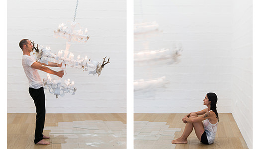 Nessuna luce, se non quella naturale dell’opera che brucia. Nessun suono, se non quello della catena che fende l’aria. Nessun costume, gli abiti sono gli stessi indossati da noi quando siamo arrivati e gli stessi che avevamo addosso quando siamo usciti. Saranno un centinaio di chili di vetro, crani e cera che pendono dal soffitto. Tutto gocciola, noi e l’opera che si consuma e si crea.