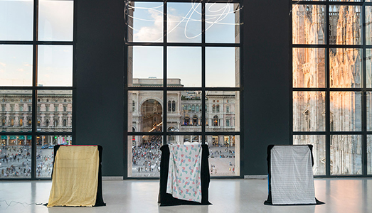 Milano inscatola la performer in una scenografia perfetta, mentre l’arabesco di luce irriverente ed eterno riflette senza smettere quelli che si muovono dentro, quelli che si muovono fuori.