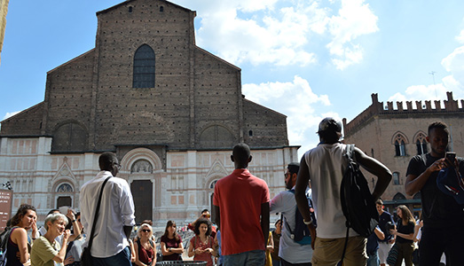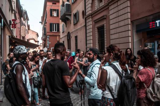 Il primo appuntamento a cui abbiamo preso parte è stato il Migrantour. Alcuni rifugiati politici e richiedenti asilo ci hanno guidato nel centro storico di Bologna. Piazza Verdi, il ghetto ebraico, Piazza Maggiore, luoghi che per chi frequenta Bologna sono quotidiani e di passaggio. Le diverse visioni hanno offerto un ribaltamento di prospettiva che ha attivato la possibilità di uno sguardo diverso su luoghi che vivono nell’immaginario dei cittadini in maniera molto spesso statica.