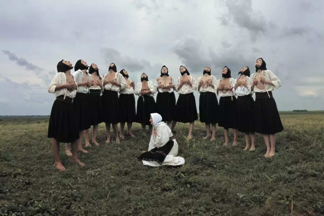 Donne che corrono nude nei campi, sollevando le gonne per spaventare gli dèi e fermare la pioggia. Corpi che si dimenano a terra in un rito di fertilità primigenio. Seni massaggiati su sepolture come gesto di risveglio della terra e della memoria. Abramovic ha ripreso questi gesti, custoditi nei villaggi di Serbia, Albania, Romania, Grecia, Kosovo, fino alle culture Rom e Sinti, restituendoli alla contemporaneità, con il rigore di chi sa che il corpo è un elemento critico.