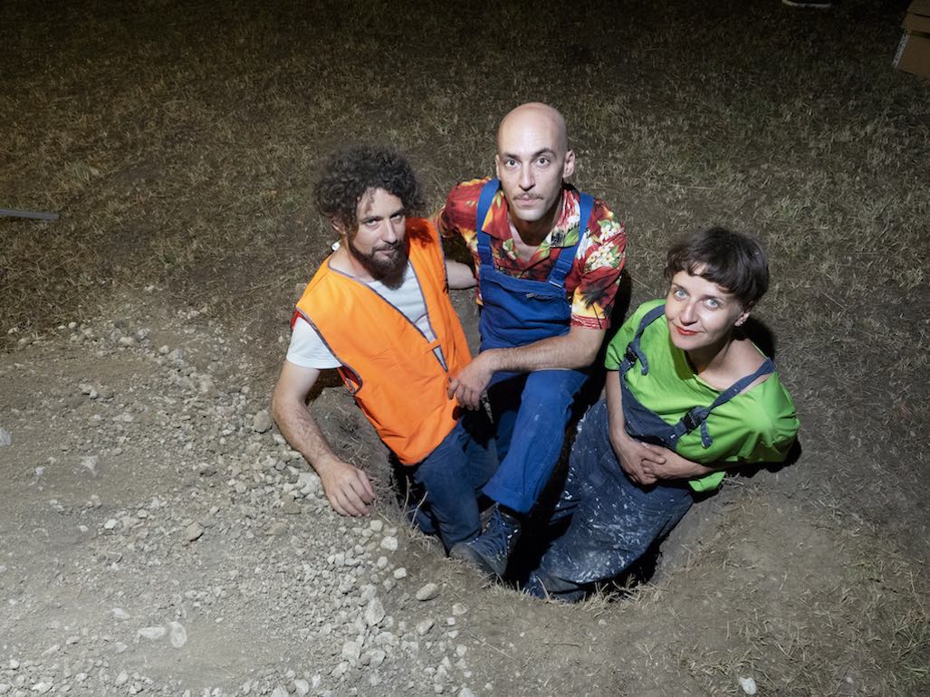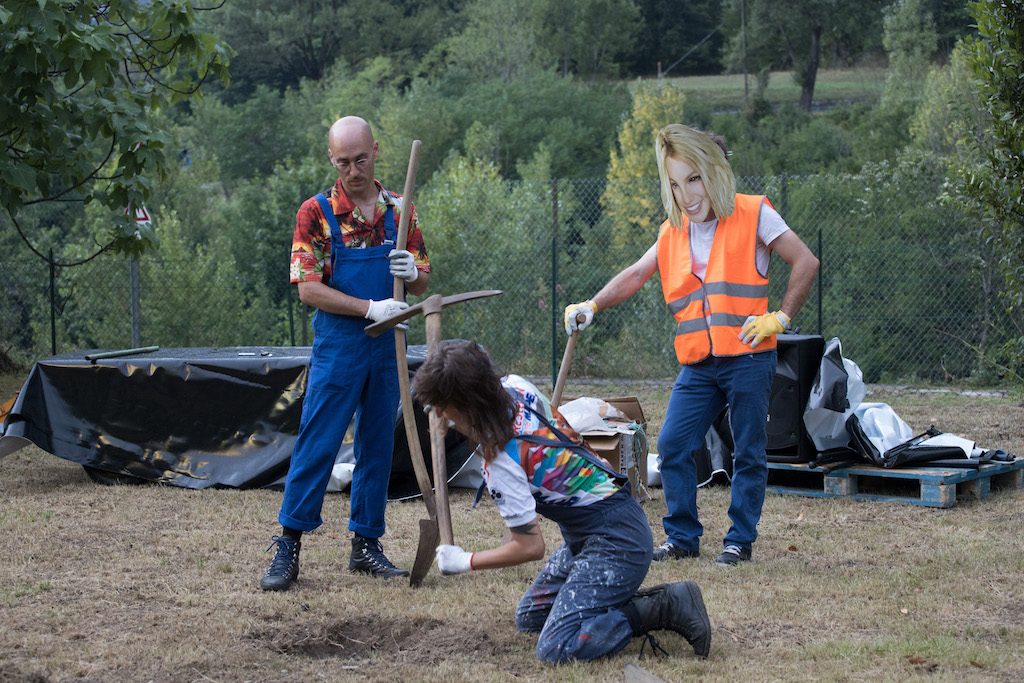 «Una volta partito il progetto siamo entrati nella bolla della band: fare finta di essere un gruppo musicale e andare in tournée. La cornice era solo apparentemente molto chiara, perché, poi, quando abbiamo suonato in club musicali come il Freak Out a Bologna o il Fanfulla a Roma, il pubblico era lì per ascoltare la musica e davanti a un progetto di questo tipo i piani entravano in confusione. Il live è uno spettacolo teatrale che è un concerto vero e proprio e gioca su tutto quello che è lo stare in scena delle rock star, ma non è dichiarato che è finto. Avevamo un estremo bisogno di riagganciarci al fare perché siamo una compagnia legata alla costruzione di oggetti della scena fin dai primi lavori…Recentemente riflettevo su questo proprio, un passato di spettacoli faticosi, fatti di macchine, costruzione e forza lavoro, realizzati totalmente in autonomia: cosa succede a tutto quel lavoro? La domanda su dove va a finire tutta la fatica fatta resta anche ora che quel tipo di lavoro lo abbiamo lasciato da parte. Quando siamo venuti a Centrale Fies in residenza per fare il videoclip abbiamo detto a Barbara (Boninsegna, n.d.r.) che volevamo fare un altro progetto, lei si preoccupava della mancanza di spazio ma noi le abbiamo detto che volevamo fare un buco. C’è un po’ tutto nella questione del buco: lo scavarsi la fossa, il gioco dei bambini, i becchini di Amleto, la terra è anche molto metal. Quando abbiamo fatto il buco mi ha un po’ innervosita l’aspettativa muscolare dell’azione, tutte quelle domande: come sarà il buco? quanto sarà grande? Quanto profondo?…Ma non era quello il punto, dovevamo scavare e farlo insieme alle altre persone. È una strana condizione questa, in cui Nicola (Toffolini n.d.r.) e Marcello (Batelli n.d.r.) sono in scena, ma non sono propriamente dei performer, che poi è la stessa condizione in cui Marcello si è trovato quando abbiamo fatto il disco, lui sapeva farlo noi no. Ecco, il buco lo sapevamo fare tutti e tre».