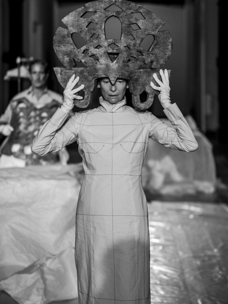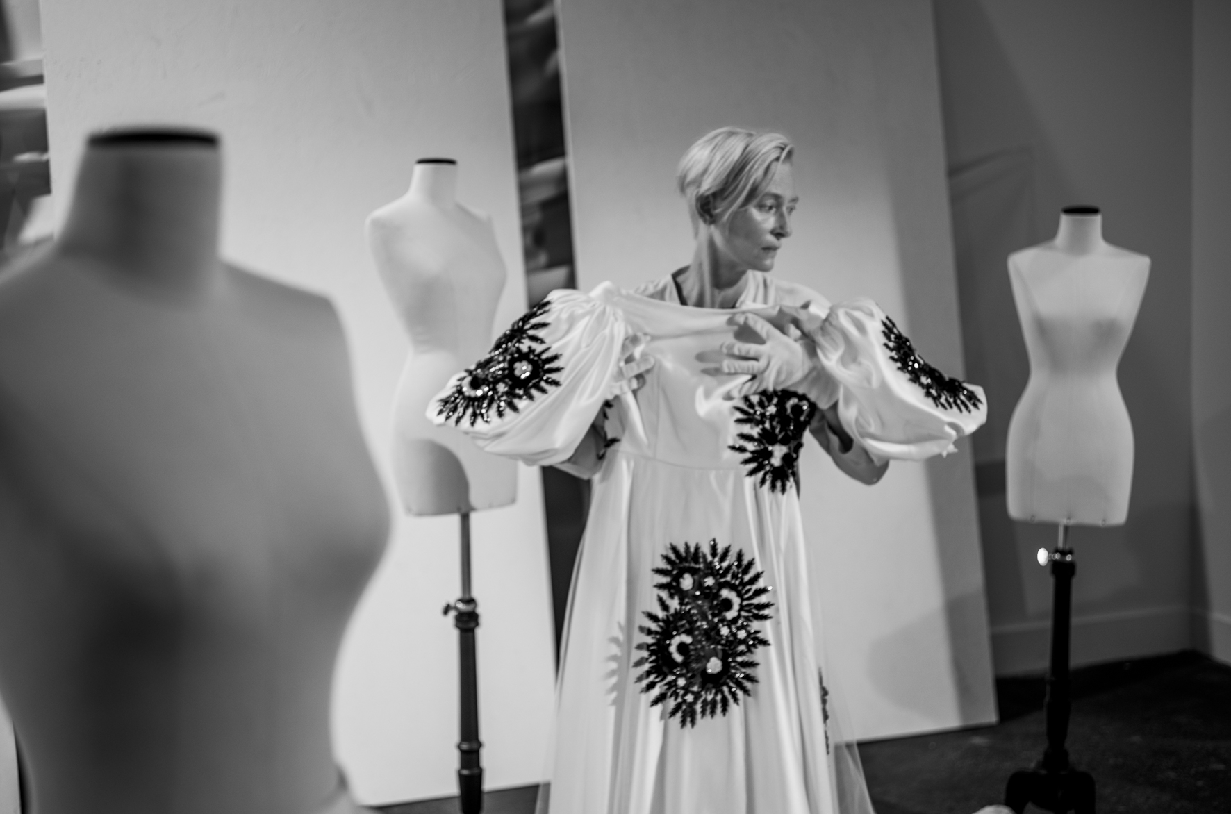 Fino al poetico finale, quando scarta abiti e accessori eseguiti per Salò o le Centoventi giornate di Sodoma davanti a uno specchio, rivelando un pizzico di vanità femminile: cappellini, corsetti, perfino un bouquet da sposa vengono manipolati e osservati con uno sguardo malinconico, prima della conclusione affidata all’abito indossato da Totò in Uccellacci e uccellini. L’ultima riflessione riguarda il titolo dello spettacolo, nell’ambito del progetto Romaison curato da Clara Tosi Pamphilj: Embodyng Pasolini. In inglese la parola “embodying” sottintende la presenza di un corpo, mentre in italiano il termine si traduce con “incarnando” sottolineando invece l’elemento della carne. Tilda non è carne ma puro corpo, proteso a donare la sua fisicità lunare agli abiti, realizzati con materiali molto tattili e preziosi. Sono loro i veri protagonisti, mentre lei appare flessuosa e volatile, come se il suo corpo fosse fatto di una forma sottile di energia, giunta a noi direttamente dal futuro.