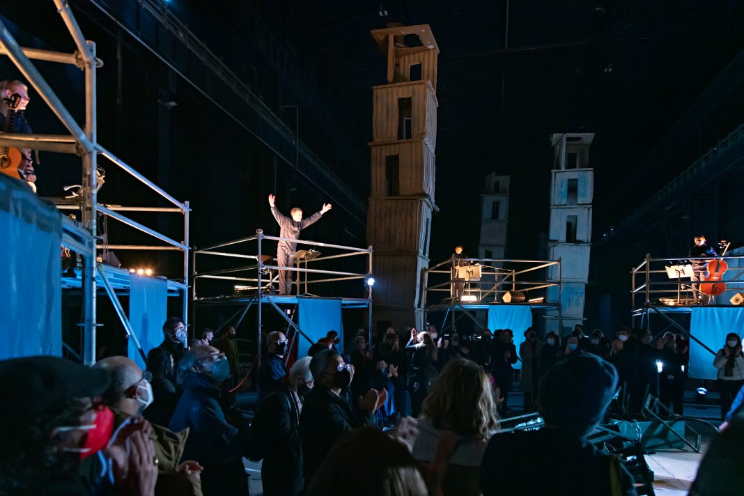 Lo spazio scenico, sul quale incombono impassibili le sette torri celesti di Anselm Kiefer, abbraccia e sommerge la platea, ne inonda lo spazio; il pubblico è libero di scegliere le due modalità di visione che gli si presentano, aggirarsi tra i numerosi spazi performativi oppure fermarsi in un solo punto e osservare questa ciclopica performance animarsi e dare vita ad un unico quadro. Un solo elemento è irraggiungibile e sospeso sullo spazio allestito in collaborazione con Andrea Anastasio, ed è l’orchestra che esegue l’opera lirica “Mare Nostrum” di Mauricio Kagel mentre gli spettatori in basso sono travolti tra le note ed i relitti da un vortice di storie narrate da Muna Mussie, che li trascina e li intrappola sott’acqua.