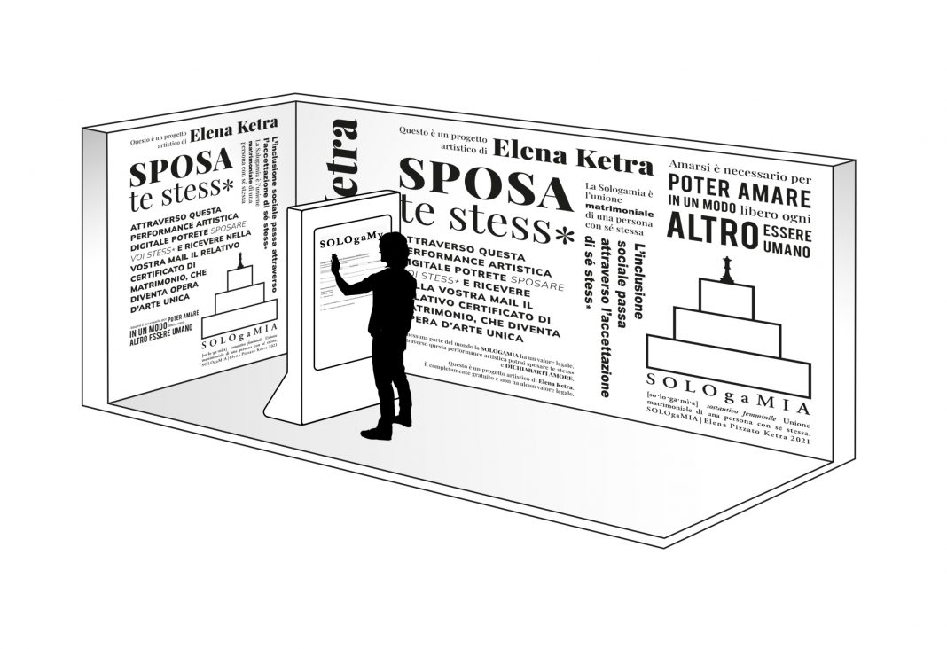 Sologamy.org è una performance digitale dell’artista Elena Ketra. Il progetto rappresenta una dichiarazione d’amore, è l’affermazione della propria indipendenza affettiva, la presa di coscienza di sé e delle proprie capacità, forza e bellezza, al di là di diktat estetici, sociali e sessuali uniformanti. Collegandosi al sito, si potrà dichiararsi amore e sposare se stess*, ricevendo poi anche il relativo certificato, che diventerà un’opera originale e unica dell’artista. La Fondazione Solares per le Arti di Parma, porta il progetto Sologamy a Roma, dal 13 luglio al 17 giugno, all’interno della manifestazione Videocittà. Qui, attraverso un totem multimediale, chiunque potrà partecipare alla performance e sposare se stesso. Basterà dunque seguire il percorso digitale, dichiararsi amore e rispetto e accettare così il matrimonio sologamico.