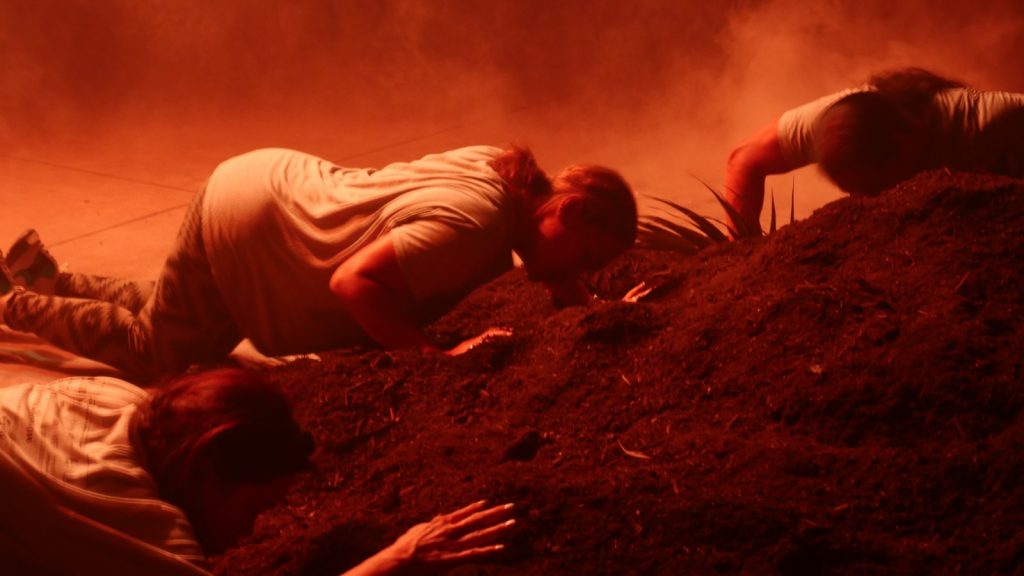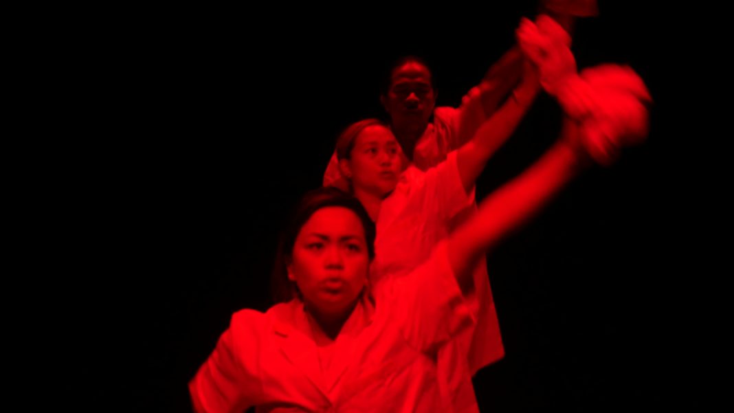 Il dispositivo è insieme appendice ed estensione della performance Il Mio Filippino, atto unico in tre quadri, dove attraverso una coreografia di movimenti nitida, i performer riproducono i gesti della cura domestica, con forme robotiche e ritmi meccanici, sino allo stremo, seguendo un processo di esaurimento fisico dei corpi. In una luce rossa e densa, si muovono intorno alla centralità di un mucchio di terra, tumulo, tophet, insieme casa, al cui centro è posta un kulambo, sorta di zanzariera tradizionale, evocazione di un’altra terra, di un arcipelago abbandonato che ora è solo memoria, ricordo, e insieme prospettiva della fine. In questa danza dei tre protagonisti, Benjamin Vasquez Barcellano Jr, Sheryl Palbacal Aluane, Jenny Guno Llanto, si apre attraverso la maestria del montaggio di Dela Cruz, la proiezione degli scenari di una storia coloniale plurisecolare, che si consuma dalla dominazione spagnola a oggi, in una costellazione di note e appunti che il regista puntella: la cultura indigena, i quaderni dell’esploratore italiano Antonio Pigafetta, le successive colonizzazioni giapponese e americana, le schiavitù contemporanee, la violenza e la dimensione di una diaspora che coinvolge il pianeta, e che vede nella biografia di Dela Cruz un’importante eco.