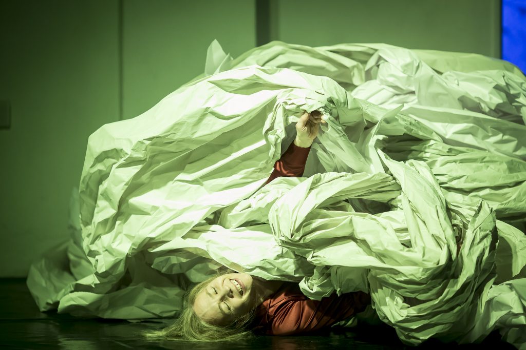 Il vuoto è tecnicamente impossibile da toccare o pensare. La carta ci è sembrata perfetta per manifestarlo: occupa uno spazio visibile, ma può anche essere compressa fino a diventare quasi nulla. Si tratta di carta riciclata dalle bobine dei quotidiani, che poi continua a modificarsi di pari passo con la danza. Anche qui è visibile il processo: prendi qualcosa che c’è già e la trasformi. È ciò che fa la performance, è ciò che fa l’arte.