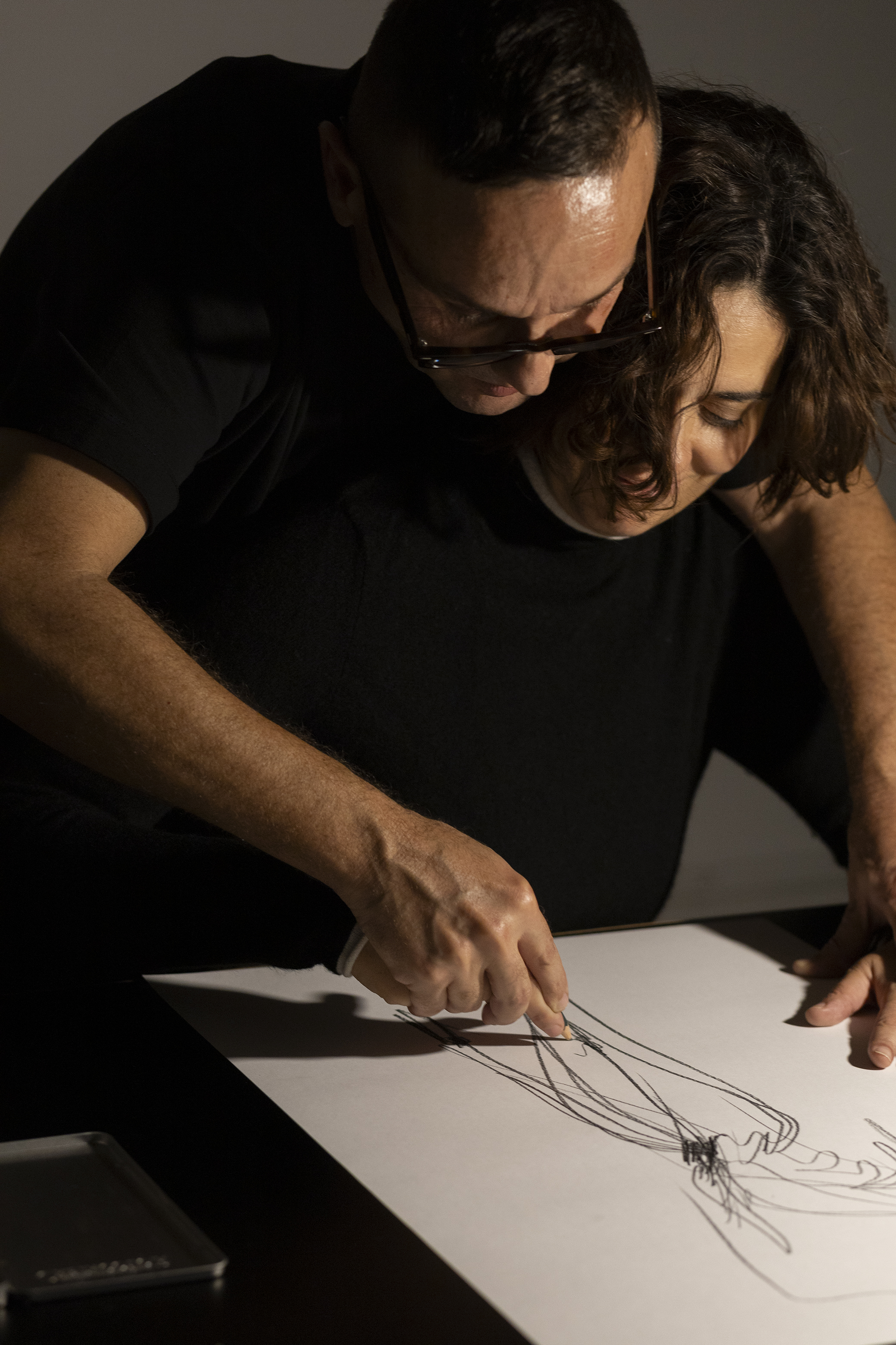 Uno alla volta, ciascun fruitore poteva entrare nello spazio performativo, veniva accolto in un’ambiente “di lavoro” e fatto accomodare su uno sgabello. Al centro della sala un vasto tavolo con pile di carte, matite e temperamatite. Nell’ambiente, illuminato da una sola lampada, Sylvio Giardina prendeva un foglio e accompagnava manualmente il fruitore nella realizzazione di un disegno. Ricavando così molteplici bozzetti di capi di moda, parte dell’immaginario dello stilista, ispirati ai movimenti e al rapporto instaurato con la singola persona.