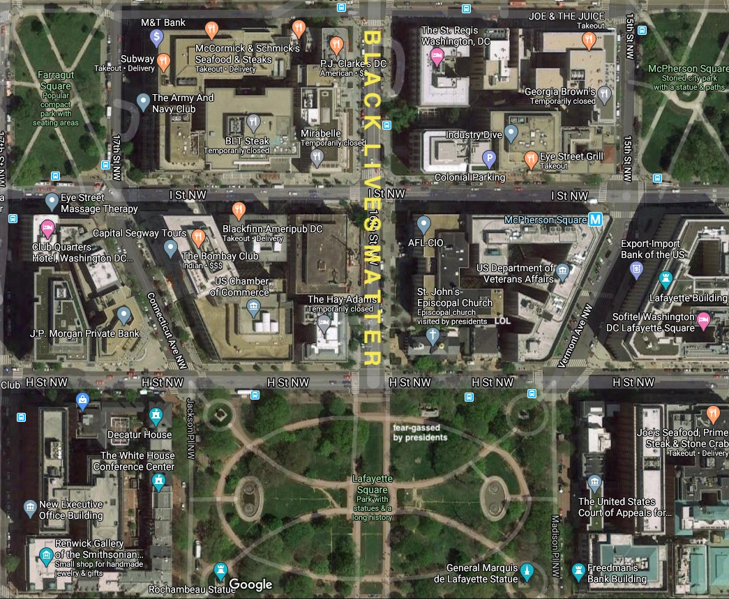 Los Angeles – Una ragazza alza il pugno davanti a un veicolo della polizia in fiamme (Fonte: Guardian; Photograph: Ringo H W Chiu/AP). - Black Lives Matter. Scritto in giallo, a caratteri cubitali, sull’asfalto della strada che conduce direttamente alla Casa Bianca. Lo ha permesso il sindaco di Washington DC, intitolando al movimento una piazza e dando il via libera ai lavori per questo importante progetto. «Simboleggia la solidarietà della città verso il movimento BLM e le persone che stanno chiedendo di vedere riconosciuta la loro umanità. Noi abbiamo l’opportunità di diramare questo messaggio forte e chiaro in una strada molto importante della nostra città e così abbiamo fatto», ha dichiarato il sindaco. (Fonte: Artforum)
