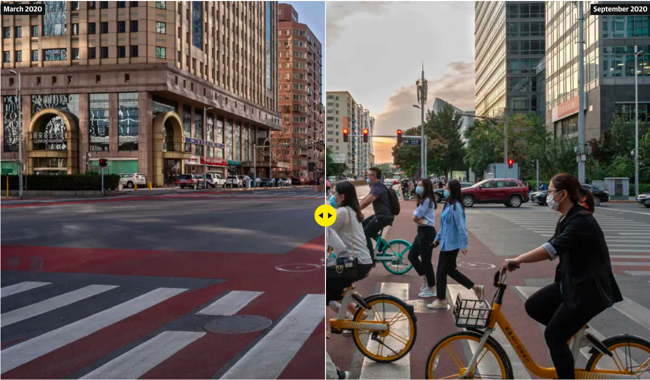 Tra le notizie dal mondo dell’arte di questa settimana, la riscoperta del New York Times del bellissimo “Autoritratto con pelliccia” di Dürer (1500), conservato alla Alte Pinakothek di Monaco di Baviera. - Sono bellissimi questi progetti interattivi. Un articolo simile è questo reportage fotografico del Guardian. Nel tentativo di tornare a una normalità post lockdown, in Cina i negozi riaprono e le strade tornano a popolarsi. Nell’articolo sono presentate foto di alcuni punti strategici di Pechino: un centro commerciale, l’aereoporto, strade del centro. Basta scorrere con il cursore per vedere lo stesso punto fotografato a marzo di quest’anno, completamente deserto, e ripopolato a settembre. L’effetto è straniante, ma estremamente suggestivo.