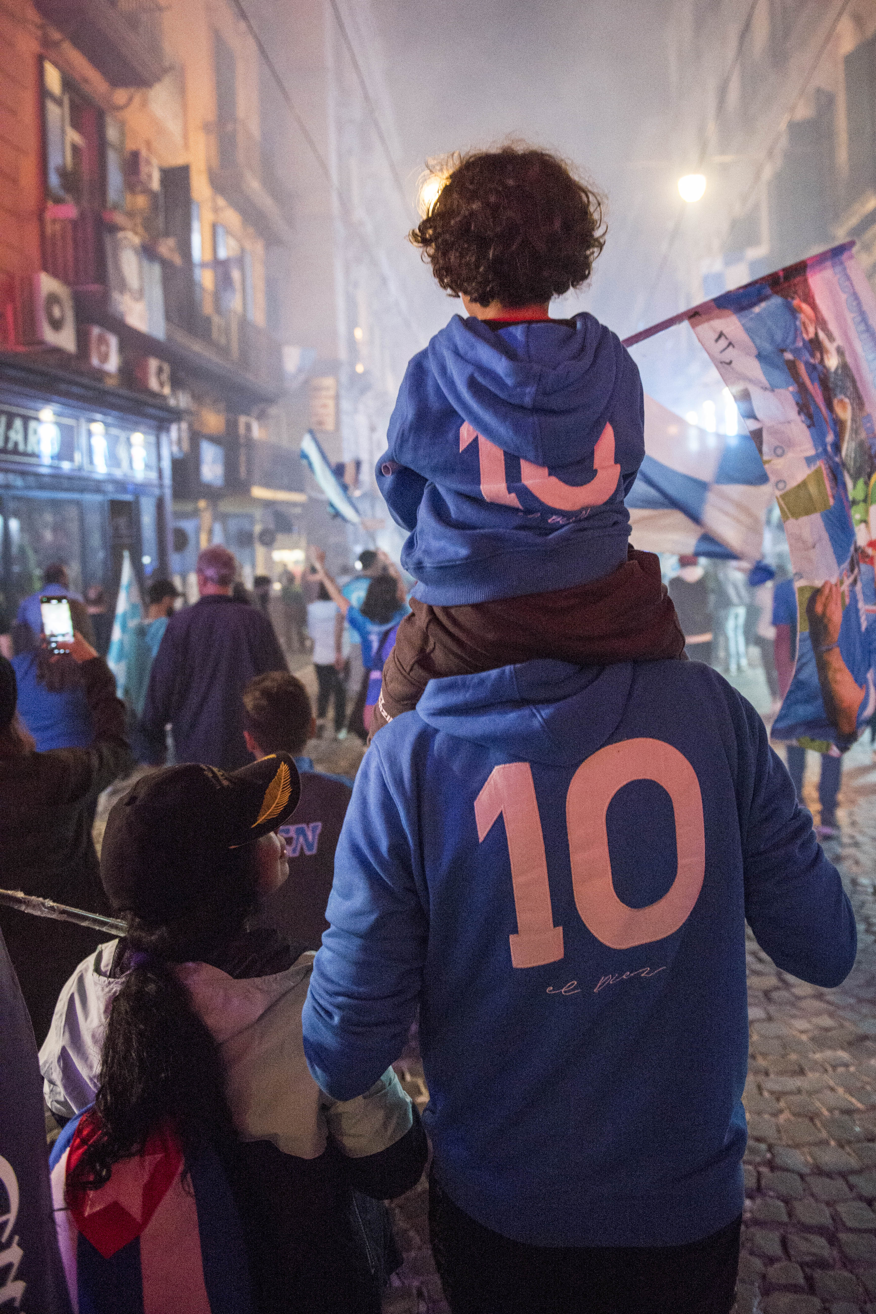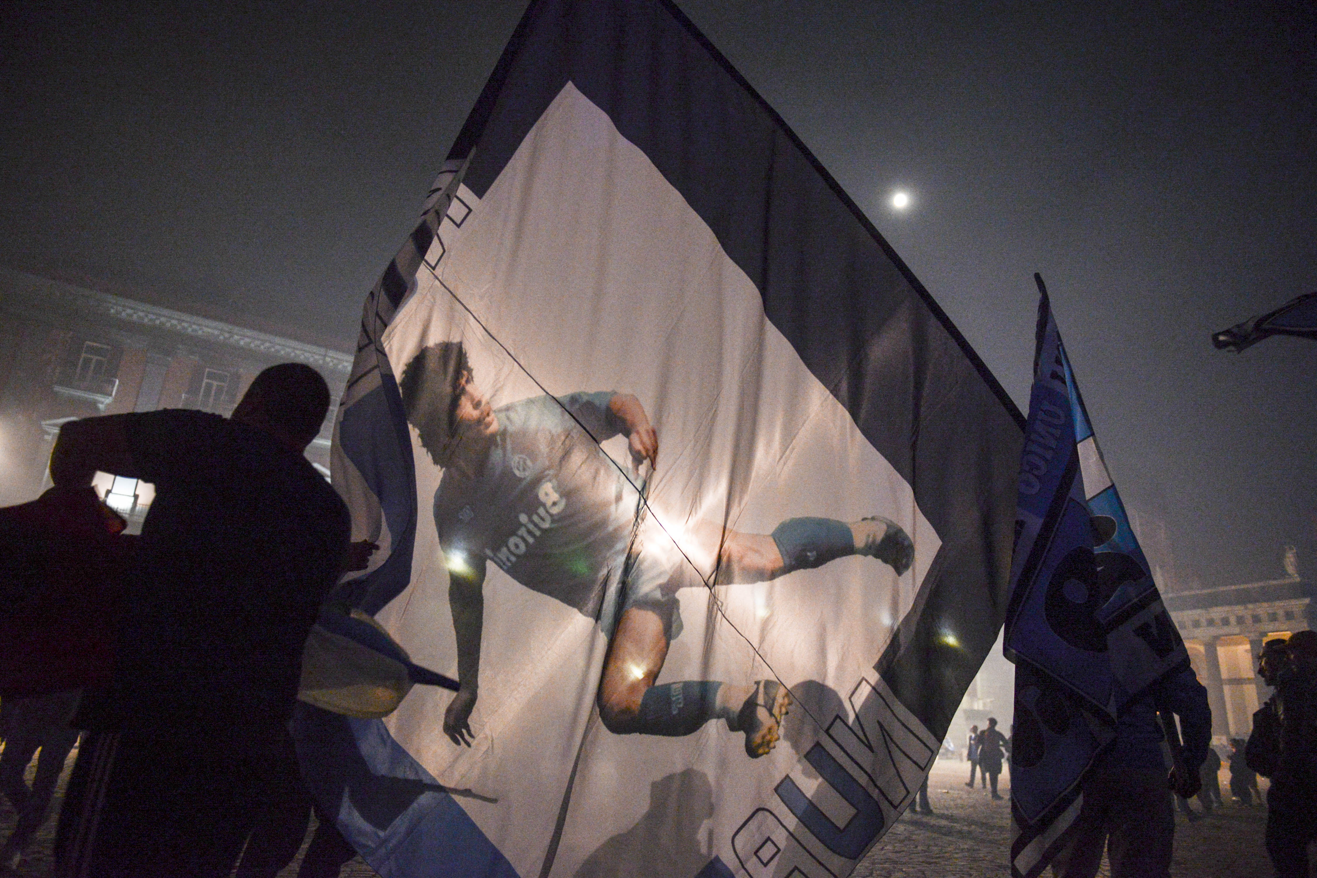 Gli ultimi minuti sono un conto alla rovescia scolpito nell’aria, ormai crepitante di elettricità. Quindi arrivano i pochissimi secondi prima del triplice fischio che nessuno riuscirà mai a sentire e il tempo si appiattisce, così come lo spazio, i calciatori in campo, qui corpi benedetti dalla folla e ricoperti di immagini sacre, alzano le mani verso il cielo di Udine e sembrano scuoterci tutti insieme sulla terra, da una parte all’altra del mondo, dall’uno all’altro mare. Cosa è successo? Non si saprà mai precisamente ma è successo, sta per succedere, succederà, si vede sui volti delle persone che abbraccio e sento tremare, che saltano e si baciano mentre gli occhi si riempiono di fumo azzurro e la notte si tinge di mille esplosioni. Camminiamo ma rimaniamo fermi, le strade si svolgono su se stesse come ruotando un caleidoscopio scintillante. I monumenti, le fontane, le insegne al neon dei chioschi, tutto prende forma nella celebrazione. La striatura prolungata, persistente, delle sirene e delle trombe ci accompagna lungo il flusso, attirandoci e respingendoci come i compagni di Ulisse alla deriva. Bandiere, striscioni, sciarpe, magliette, i tessuti luccicano con la luna piena e chiarissima, increspandosi come onde. Anche i Castelli si illuminano, dalle belle terrazze di Palazzo Reale le troupe televisive puntano le telecamere su Piazza Plebiscito. Nell’odore acre dei fumogeni è facile perdere l’orientamento, poi la pesante foschia si apre come un drappo e svela il coro sulla scena, le voci all’unisono continuano a ricamare questo sogno collettivo. Migliaia, milioni di immagini si sovrascrivono nella storia della città, ognuna lasciando impressa, nella memoria di pietra delle architetture e nelle sfuggenti sensazioni della pelle, una piccola, preziosa traccia di quello che è successo e che succederà.