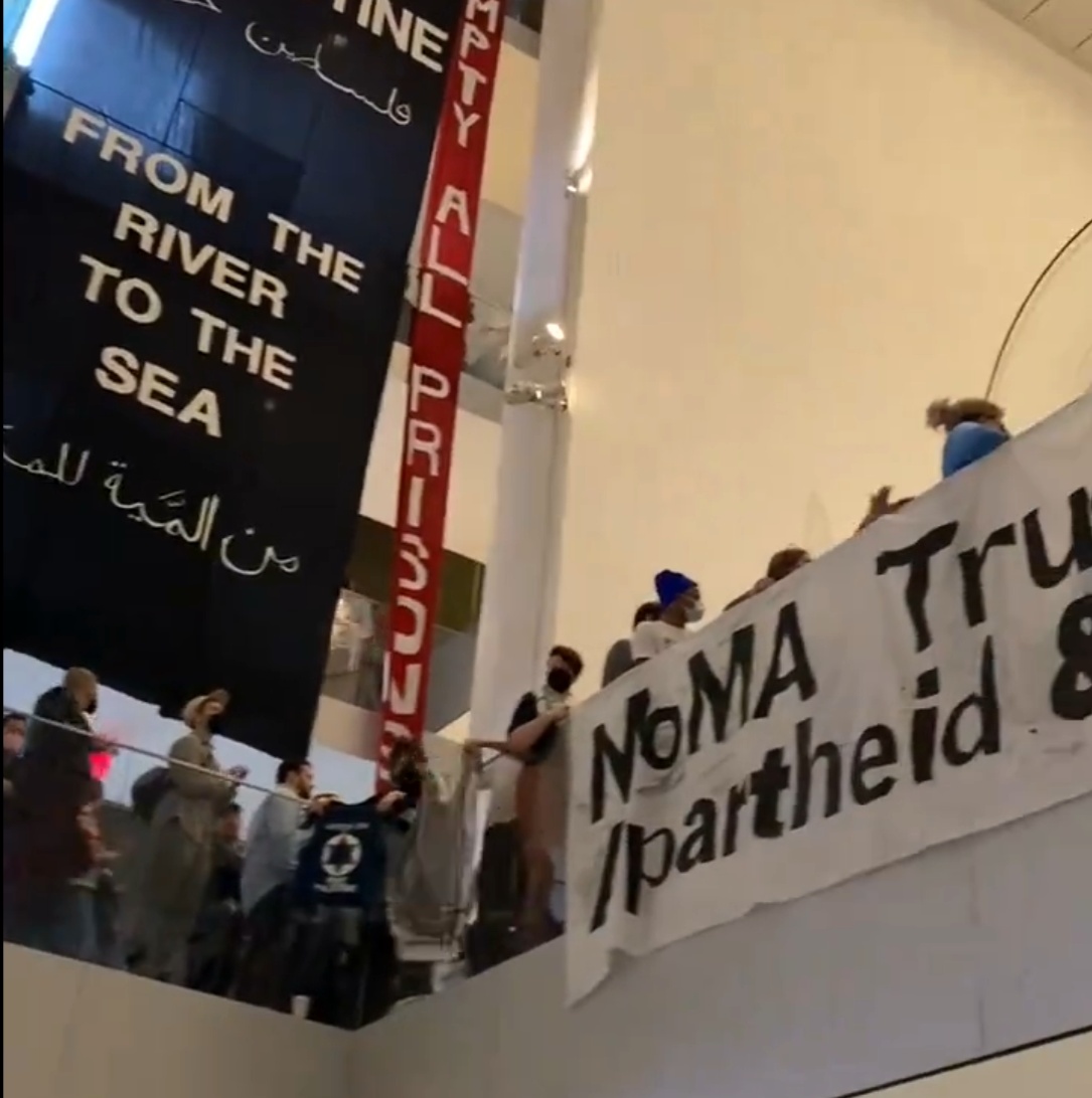 Le immagini e i video, pubblicati su Instagram e condivisi dai profili di migliaia di persone, mostrano diversi banner svolti all’interno dell’atrio del MoMA, con le scritte “Palestina libera, dal fiume al mare”, “Cessate il fuoco adesso”, “Gli operatori culturali stanno con Gaza”, accusando anche apertamente i membri del consiglio di amministrazione dell’istituzione di finanziare “Genocidio, apartheid e colonialismo”. «In questo momento cruciale, rifiutiamo l’arte come cortina di fumo per il genocidio e chiediamo l’immediata rimozione dei membri del consiglio con legami diretti con il genocidio, l’apartheid e il colonialismo», continua il testo esteso dai manifestati.