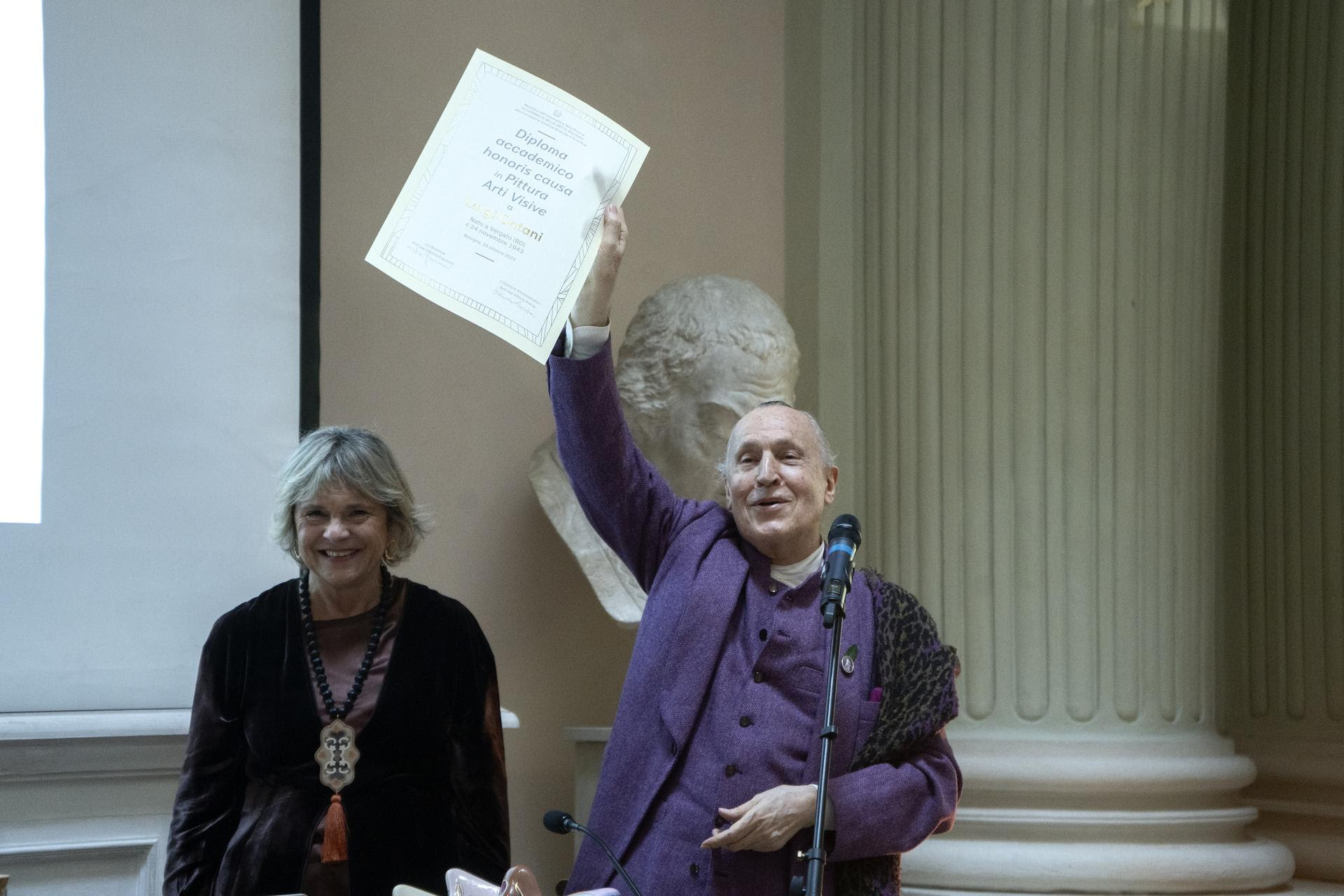 L’Accademia di Belle Arti di Bologna ha conferito il suo primo Diploma accademico honoris causa in Pittura Arti Visive al visionario artista Luigi Ontani, figura chiave della scena internazionale, celebrando al contempo l’apertura della rinnovata Ala Irnerio, che aggiunge 2mila metri quadrati alla storica struttura. La cerimonia, svoltasi nell’Aula Magna, ha visto la presenza delle più alte cariche dell’Accademia, con interventi della Presidente Rita Finzi e della Direttrice Cristina Francucci. La Laudatio della Professoressa Maria Rita Bentini, docente di Storia dell’Arte, ha rievocato l’eclettismo di Ontani, il suo approccio iconico alla maschera e alla performance, mentre lo stesso Ontani, in una Lectio magistralis, ha ripercorso i momenti salienti della sua carriera artistica, riflettendo sull’importanza della sperimentazione e dell’incontro con culture altre. La cerimonia è stata suggellata dalla lettura poetica di Lorenzo Sassoli de Bianchi, che ha evocato l’immaginario onirico di Ontani, artista in costante dialogo con miti e simbologie dal fascino universale.