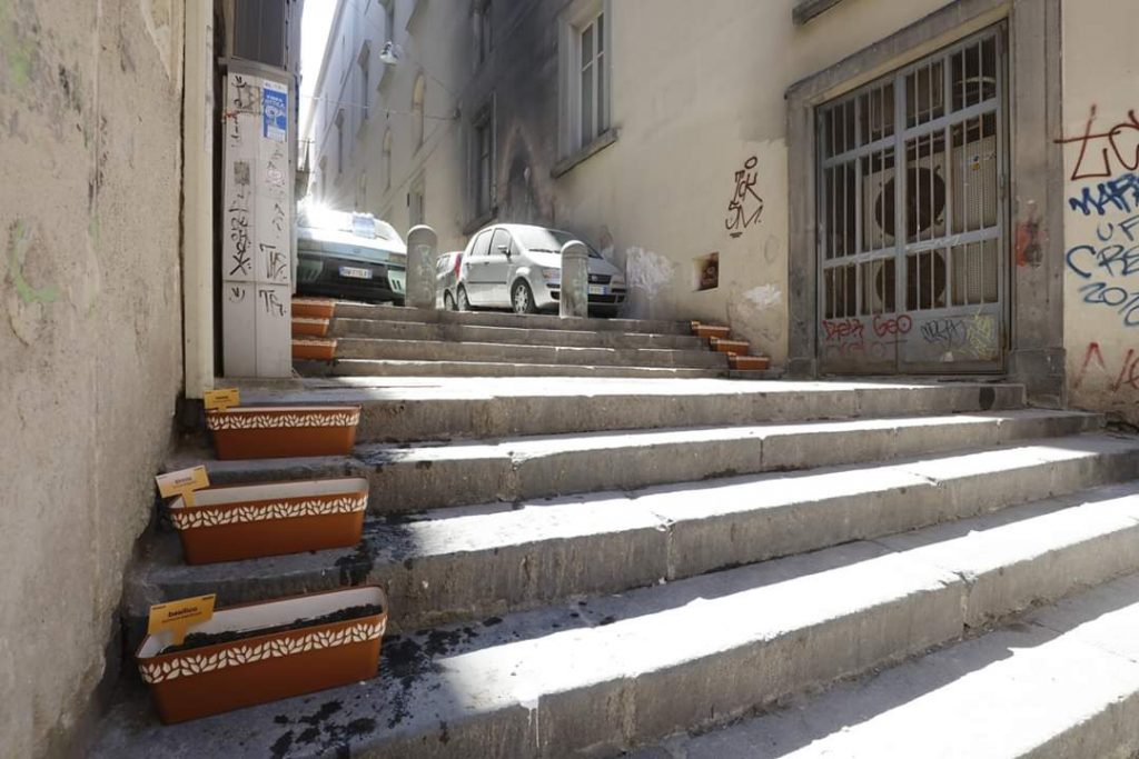 Un’iniziativa quasi da disperazione e, insieme, di testimonianza di una militanza coraggiosa a fronte della persistente condizione di degrado che ha trasformato l’ingresso del Museo Madre (via Settembrini, cuore del centro storico di Napoli) in una discarica di immondizia a cielo aperto. Un’adozione, arricchita di sistemi fai da te – quali la messa in opera di vasi con erbe aromatiche – dopo una pulizia acrobatica contro carcasse di motorini, arredi, elettrodomestici, carte, metalli, plastiche oltre che siringhe e rifiuti organici.