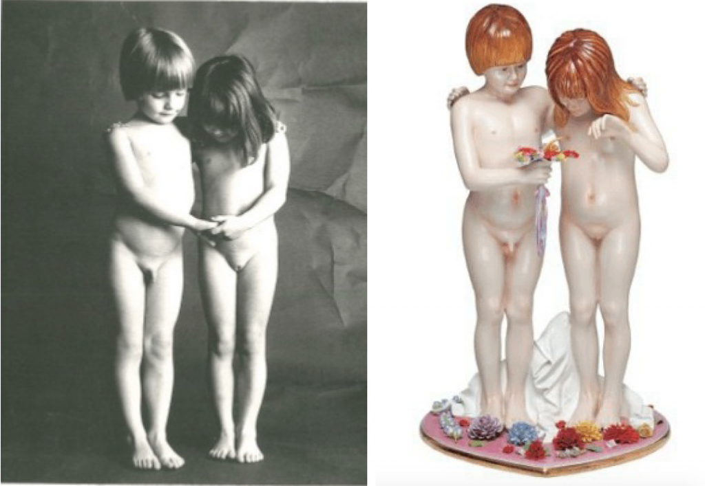 L’opera incriminata è Naked, scultura in ceramica della contestata serie Banality, risalente al 1988, che i giudici hanno trovato uguale, troppo uguale, a Enfants, fotografia di Bauret pubblicata come cartolina nel 1975. L’immagine originale di Bauret e la statua di Koons raffigurano entrambe un bambino e una bambina nudi che, abbracciati, guardano verso il basso. A dire il vero, nella fotografia osservano le loro mani intrecciate, mentre nella scultura un mazzo di fiori, mantenuto dal bambino.