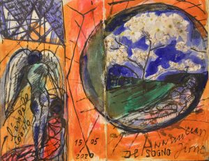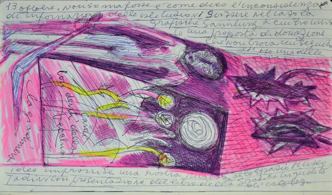 Sfogliare Moleskine 2020 Pandemia – a cura dello stesso Ferrari assieme a Marta Silenzi, Edizioni Zedia – è come affrontare un libero riassunto di quanto l’anno appena trascorso ci ha offerto. Un bignami insomma, però dal testo cifrato, da leggere tra le pagine delle mitiche agendine che Ferrari ha riempito con i suoi schizzi, appunti, disegni. È il tempo di una “clausura” che ritrova la propria libertà tra i segni grafici a biro, le geometrie ad uso e consumo personale, il colore che salta fuori prepotente, tra le parole di un corsivo che manifesta apertamente il suo aplomb personalistico. Sono pagine in cui Ferrari de-secreta l’essenza di quei mesi “caldissimi” compresi tra marzo e agosto, svelando di pari passo quanto si nasconda nella mente – e tra le mani – di un artista.