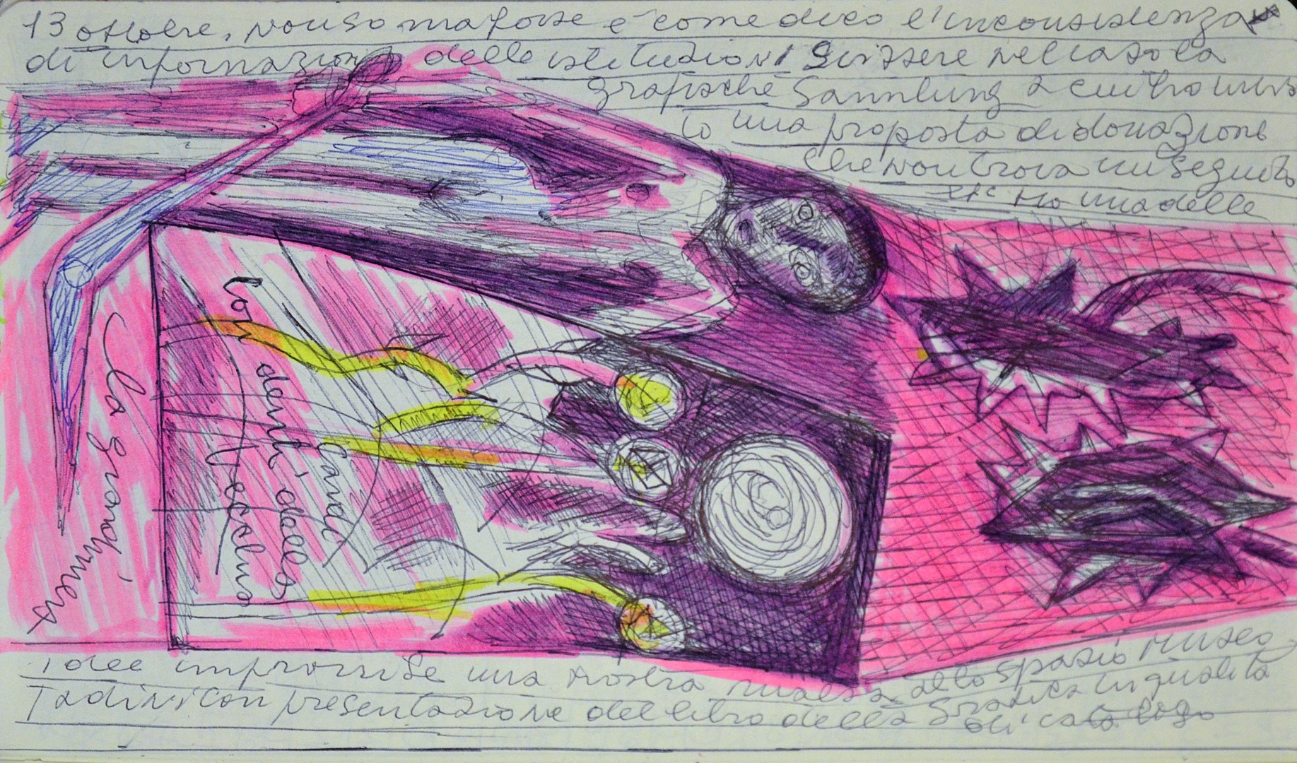 In tempi “normali”, chiamiamoli così, una Moleskine rappresenterebbe semplicemente il più classico dei cahier d’artiste; quell’oggetto dallo statuto privato, fedele compagno per un artista dinamico come Renzo Ferrari (Cadro, 1939), sempre intento a captare e progettare nella quotidianità in divenire.