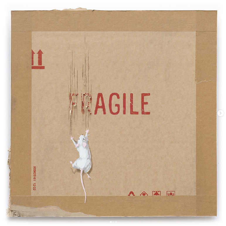 In vendita, 50 stampe a tiratura limitata raffiguranti la parola “Fragile” in rosso, sulla superficie di un cartone da imballaggio, graffiata da uno degli iconici e dispettosi topi che spesso compaiono nelle opere dello street artist anonimo. Anche la stessa parola “Fragile” è uno dei simboli più usati da Banksy, compare in un stencil con una ballerina e in un’altra opera insieme a una bomboletta spray ma in questo caso è significativo l’intervento del roditore. I collezionisti interessati erano stati invitati a registrarsi online per avere la possibilità di acquistare una delle opere, al prezzo di 5mila sterline – circa 5.600 euro – l’una.