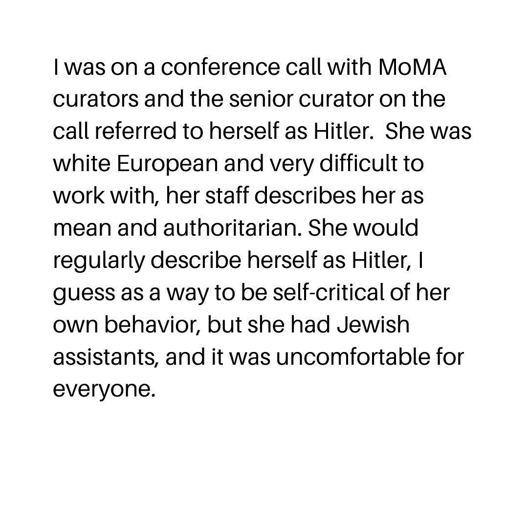 «Durante una riunione di tutto il personale SFMoMA, il senior curator bianco (Garrels) ha tenuto una presentazione su un gruppo di nuove acquisizioni. Ha terminato una presentazione sulle nuove acquisizioni di artisti di colore dicendo: “Non preoccuparti, continueremo sicuramente a collezionare artisti bianchi”».