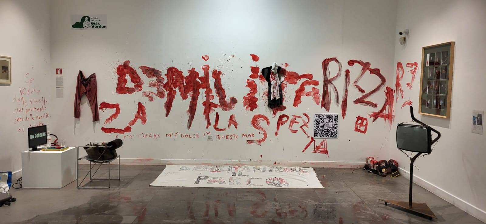 Tutto è iniziato il giorno dell’apertura dell’esposizione, il 25 giugno 2022, quando alcuni performer dei collettivi Dada Boom e SuperAzione – che compaiono nel colophon della mostra sotto la voce “Azioni e InstallAzioni Artistiche Artiviste” – hanno scritto la frase “Demilitarizzare La Spezia” a tempera rossa su muro del museo. Intitolata “Omaggio Ogiugno, la performance è andata in scena nella sala riservata alla rievocazione dell’esperienza, promossa da Verde, del Museo Popolare della Pineta, diventato poi MPGV – Museo Popolare Giåk Vërdün, un progetto di disobbedienza civile contro la costruzione dell’Asse di penetrazione nella Pineta di Levante di Viareggio.