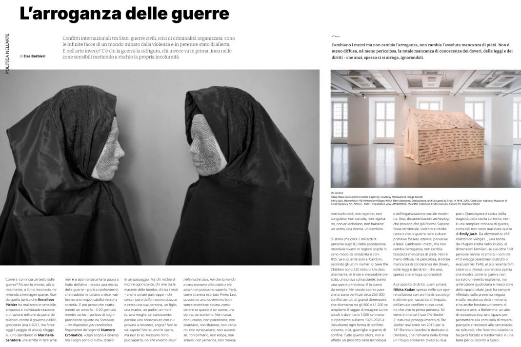 L’arte non vive dentro una bolla ed è quello che abbiamo voluto ricordare all’interno di questo stesso numero, aprendo una riflessione sul dramma di un mondo sull’orlo della Terza Guerra Mondiale e citando gli artisti che dentro i conflitti operano e costruiscono attivamente nonostante le condizioni critiche: