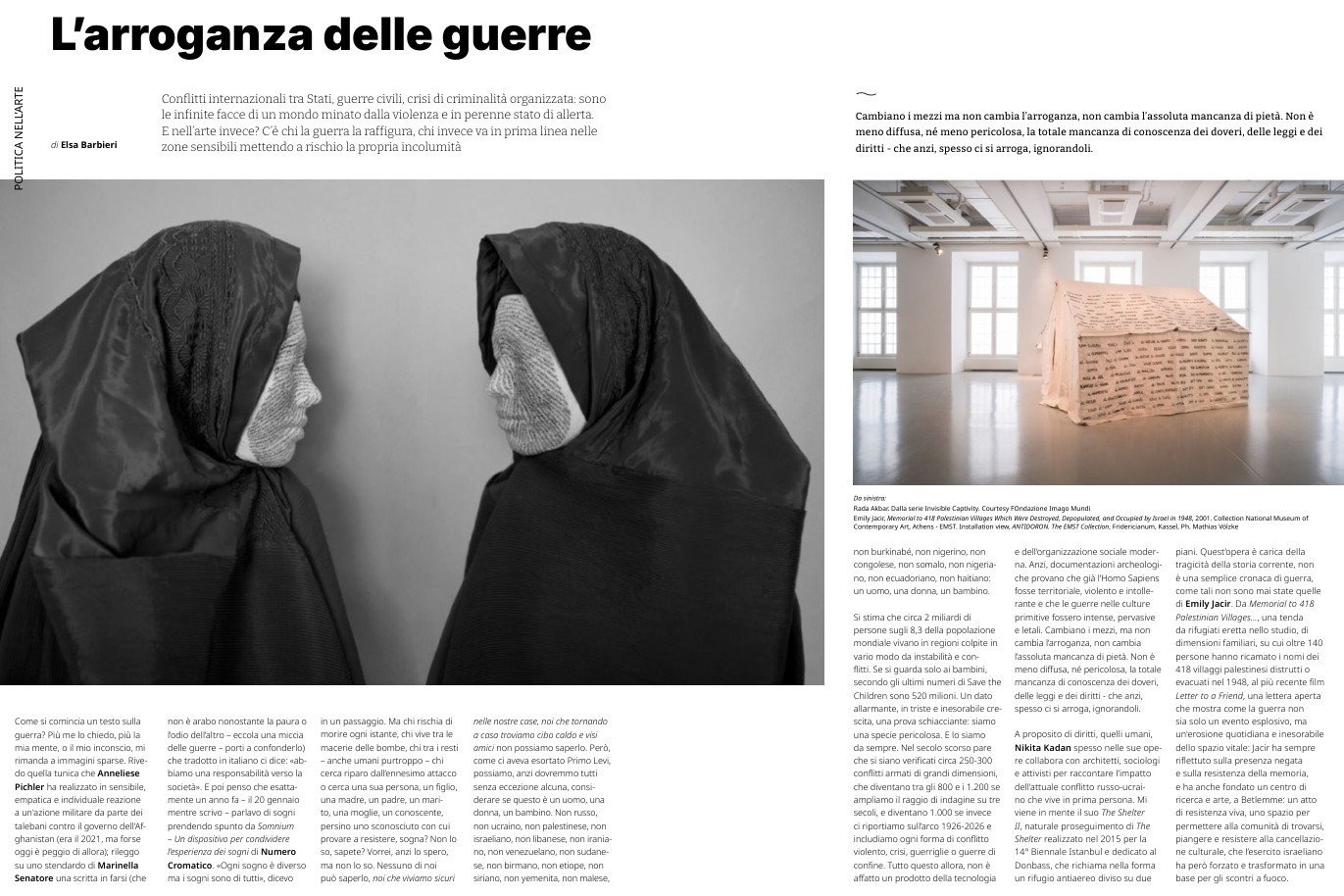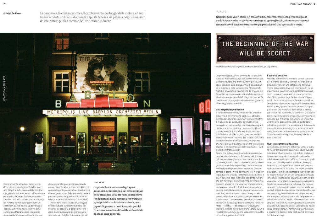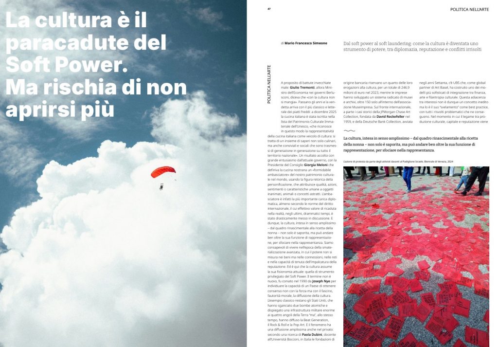 Si potrebbe andare avanti ancora, ma preferiamo lasciare ai lettori approfondire il numero appena uscito, che con coerenza affronta temi geopolitici che hanno un impatto diretto sull’arte.