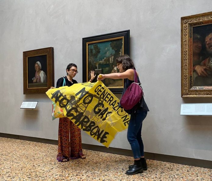 Continuano senza sosta le manifestazioni perpetrate nei musei italiani dagli attivisti per il clima di Ultima Generazione: dopo la Cappella degli Scrovegni, a Padova, i Musei Vaticani e il Museo del ‘900 di Milano e gli Uffizi a Firenze, questa volta è accaduto alle Gallerie dell’Accademia di Venezia, dove, domenica, 4 settembre, intorno alle 11:45, due giovanissime manifestanti hanno svolto un’azione di protesta incollandosi al vetro di protezione e alla cornice della Tempesta di Giorgione e srotolando uno striscione “No gas no carbone”. Azioni simili sono ormai in corso anche in altri musei in tutta Europa, in Gran Bretagna e in Germania. Di certo, Venezia, per il suo habitat tanto unico quanto fragile e costantemente a rischio, è uno dei luoghi più simbolici in cui avviare azioni del genere, contando anche che, proprio in questi giorni, si sta svolgendo la 79ma edizione della Mostra del Cinema, una delle manifestazioni più seguite al mondo.