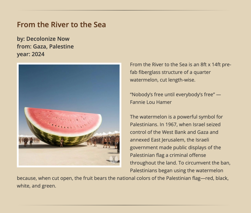 Intanto, come riportato da Hyperallergic, l’organizzazione del Burning Man, il mitico festival di otto giorni che si svolge nel deserto di Black Rock City, negli Stati Uniti, ha tolto un’opera d’arte pro-Palestina dal suo sito web, pochi giorni dopo una petizione di Change.org che chiedeva di rimuoverla. Gli autori della petizione hanno affermato che il titolo dell’opera, From the River to the Sea, Dal fiume al mare, utilizza «Un linguaggio che sostiene l’annientamento di Israele». L’opera, una installazione ambientale in fibra di vetro, non era stata ancora realizzati ma era a forma di anguria, uno dei principali simboli della resistenza palestinese all’occupazione israeliana. Il titolo si riferisce allo slogan diffuso durante le proteste internazionali contro i bombardamenti israeliani su Gaza, che hanno portato alla morte di oltre 35mila persone.