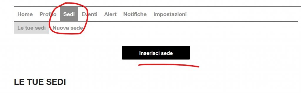 SOLO NEL (raro) CASO IN CUI LA SEDE MANCA, essa va inserita accedendo all’apposito form INSERISCI SEDE che si trova di fianco a INSERISCI EVENTO: