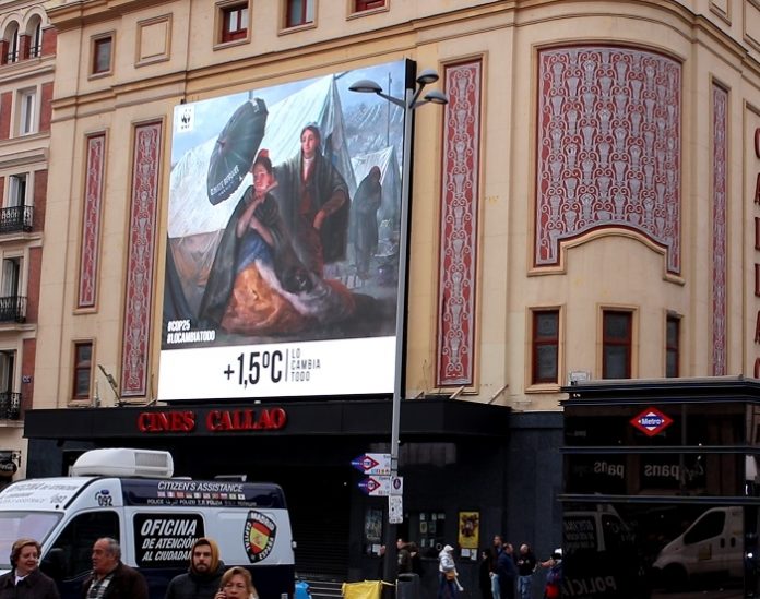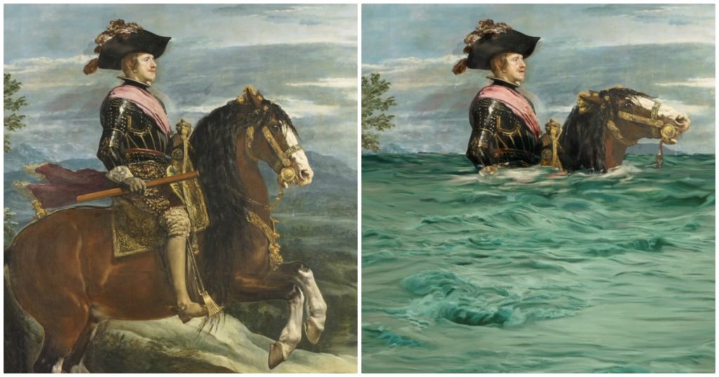 Il progetto del WWF “+ 1,5ºc lo cambia todo” ha interessato quattro capolavori della collezione del Prado, tra cui Filippo IV a cavallo, di Diego Velázquez, che illustra efficacemente l’innalzamento del livello del mare. E poi L’ombrellone di Francisco Goya, che non serve più per rinfrescare una gentile signora distesa su un verde prato ma per proteggersi dal fango di un campo di rifugiati a causa degli effetti climatici.