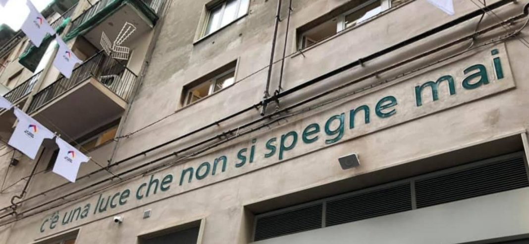Affacciata alla finestra fronte strada, una signora sorride oltre le gocce di pioggia che la separano dell’ex fabbrica di vetro in via delle Zite, la cui soglia è stata appena varcata da Roberto Fico, Presidente della Camera, da Sua Eminenza Crescenzio Sepe, Cardinale di Napoli, e da Luigi De Magistris, Sindaco di Napoli. La costruzione di cemento armato che occupa 600 metri quadrati al centro delle intricate vie di Forcella presenta, sul muro esterno, l’installazione del duo Bianco-Valente che recita C’è una luce che non si spegne mai, e si offre agli abitanti, ai passanti e ai turisti, con il suo carico di significati.