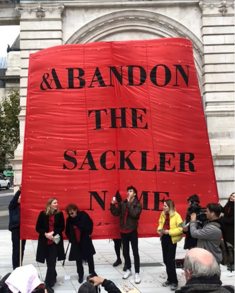 Al Victoria & Albert Museum, Goldin e gli altri attivisti hanno mostrato un grande cartello con la scritta “ABANDON THE SACKLER NAME” e hanno diffuso banconote da un dollaro macchiate di vernice rossa, per esortare il museo a cambiare il nome agli spazi dedicati. «Che cosa dovremo fare, affinché il V&A riconosca la propria responsabilità nel denunciare il nome della famiglia responsabile di una delle crisi più letali del nostro tempo?», ha scritto PAIN, in una dichiarazione pubblicata su Instagram.