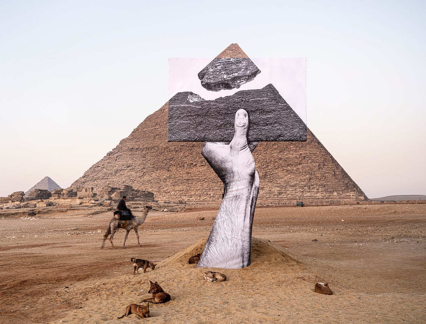 Con il patrocinio del Ministero delle Antichità e del Ministero degli Affari Esteri egiziani e dell’UNESCO, arrivata alla quarta edizione, si tratta di una mostra unica al mondo, visto che si svolge nelle aree circostanti alle Piramidi di Giza, patrimonio dell’umanità da 4500 anni. Tra gli artisti invitati, ognuno dei quali ha realizzato dei progetti site specific, anche JR, che ha presentato Greetings From Giza, una grande cartolina della Piramide con la punta staccata, e l’italiano Lorenzo Quinn, con Together, due mani giunte.