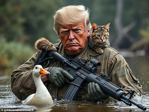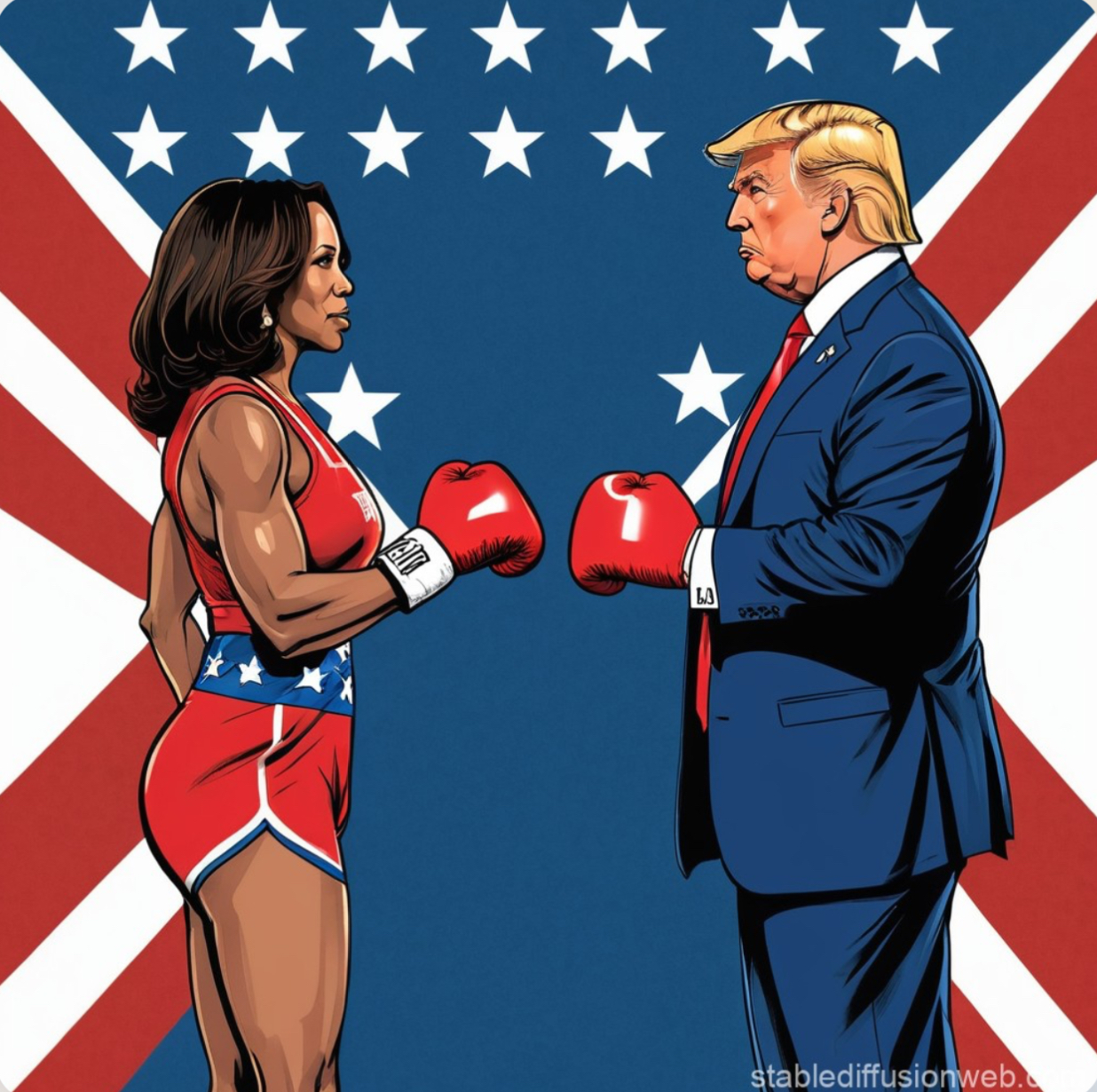 E a poco è valso evidentemente rispondere con Kamala Captain America, Kamala Lady Liberty (Statua della libertà), Kamala Boxeur contro Trump sul ring. Ecco proprio questo elemento machista, che calza a pennello sul personaggio Trump, sembra aver attecchito sull’immaginario collettivo americano. Se rimane indimenticabile il match di wrestling del 2007 in cui The Donald picchiava e rasava in mondovisione il boss della WWF Vince McMahon, il magnate americano si è sempre ben prestato a ruoli muscolari: Trump-Balboa, Trump bodybuilder, Trump gigante cyberpunk (Beeple_Crap), Trump commando (armato di AR-15 style-rife, tipico fucile da guerra dei movimenti di destra) e strenuo difensore degli animali domestici, prede ambite, a suo personalissimo parere, di voraci immigrati haitiani presenti in Ohio.