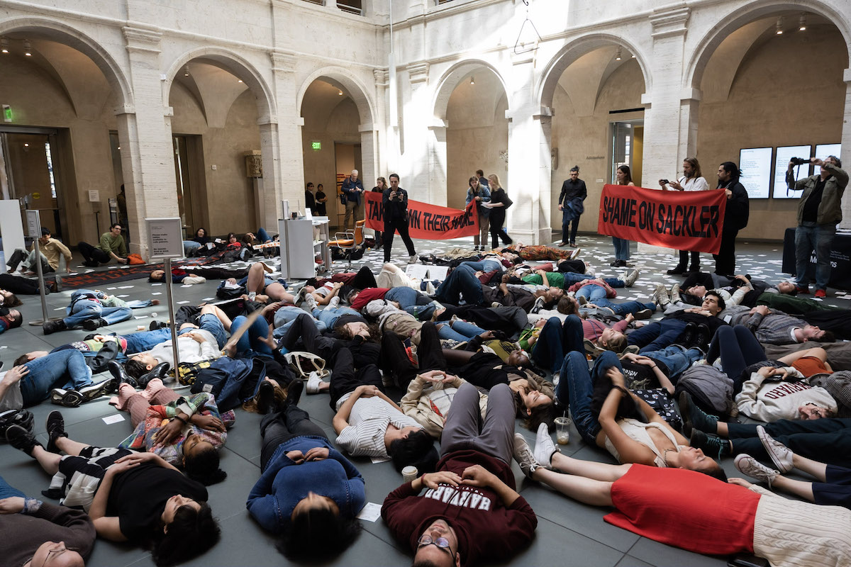 Nell’atrio dell’Harvard Art Museums, i membri di PAIN e gli studenti hanno lanciato opuscoli e flaconi, svelando degli striscioni sui quali campeggiava la scritta “SHAME ON SACKLER”, “vergogna Sackler”. In un post su Instagram, il gruppo, che già nel 2018 organizzò una protesta all’Harvard Museum, ha affermato di risposto alle richieste degli studenti, affinché la scuola tagliasse «I legami con l’eredità dei suprematisti bianchi e dei proprietari di schiavi, i cui nomi sono esposti in tutto il campus».