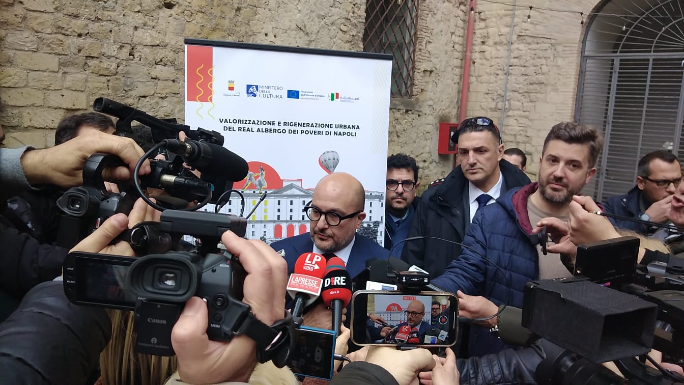 Di nuovo qui. Ancora in questo palazzo infinito, Palazzo Fuga, alias Real Albergo di Poveri. Stavolta non attraversiamo l’imponente atrio che conduce al cortile a croce, i lunghi corridoi impolverati e senza luce, le cellette confessionali ormai abbandonate. Stavolta ad attenderci ci aspetta una bella sala conferenze, poltrone nuovissime, una scrivania, due microfoni. È il giorno della firma del protocollo d’intesa tra Ministero della Cultura, Gennaro Sangiuliano, e il Comune di Napoli per la “Valorizzazione e rigenerazione urbana del Real Albergo dei Poveri di Napoli e dell’ambito urbano piazza Carlo III, via Foria, piazza Cavour”.
