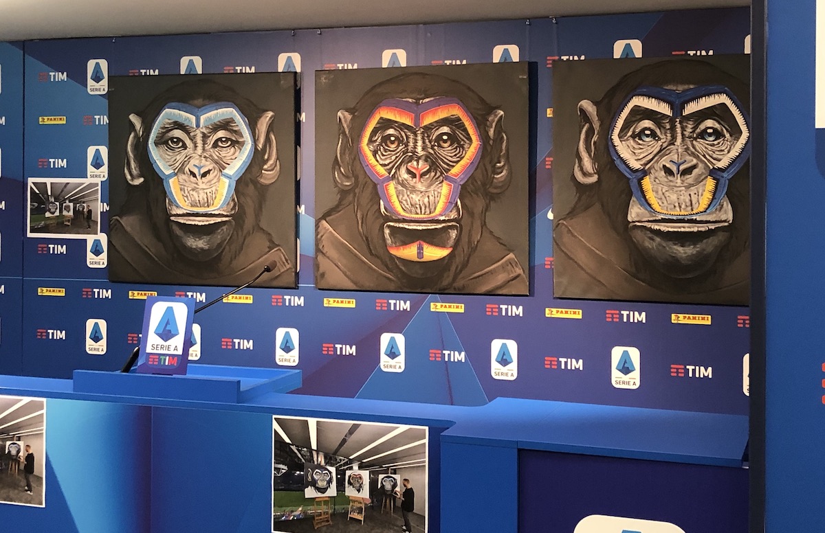 A maggio, l’artista milanese aveva dipinto una tela raffigurante tre scimmie in una sala dello Stadio Olimpico di Roma, durante la finale di Coppa Italia. L’artwork di Fugazzotto poi, nelle intenzioni della Lega Serie A, è diventato l’immagine della campagna «contro ogni discriminazione e razzismo». Letteralmente insorti i social, con duri attacchi di due squadre di serie A, Milan e Roma, questa già coinvolta nel boicottaggio per il caso del titolo “Black Friday” del Corriere dello Sport, e critiche di testate giornalistiche anglofone, dal NYTimes, al Washington Post, passando per la BBC.