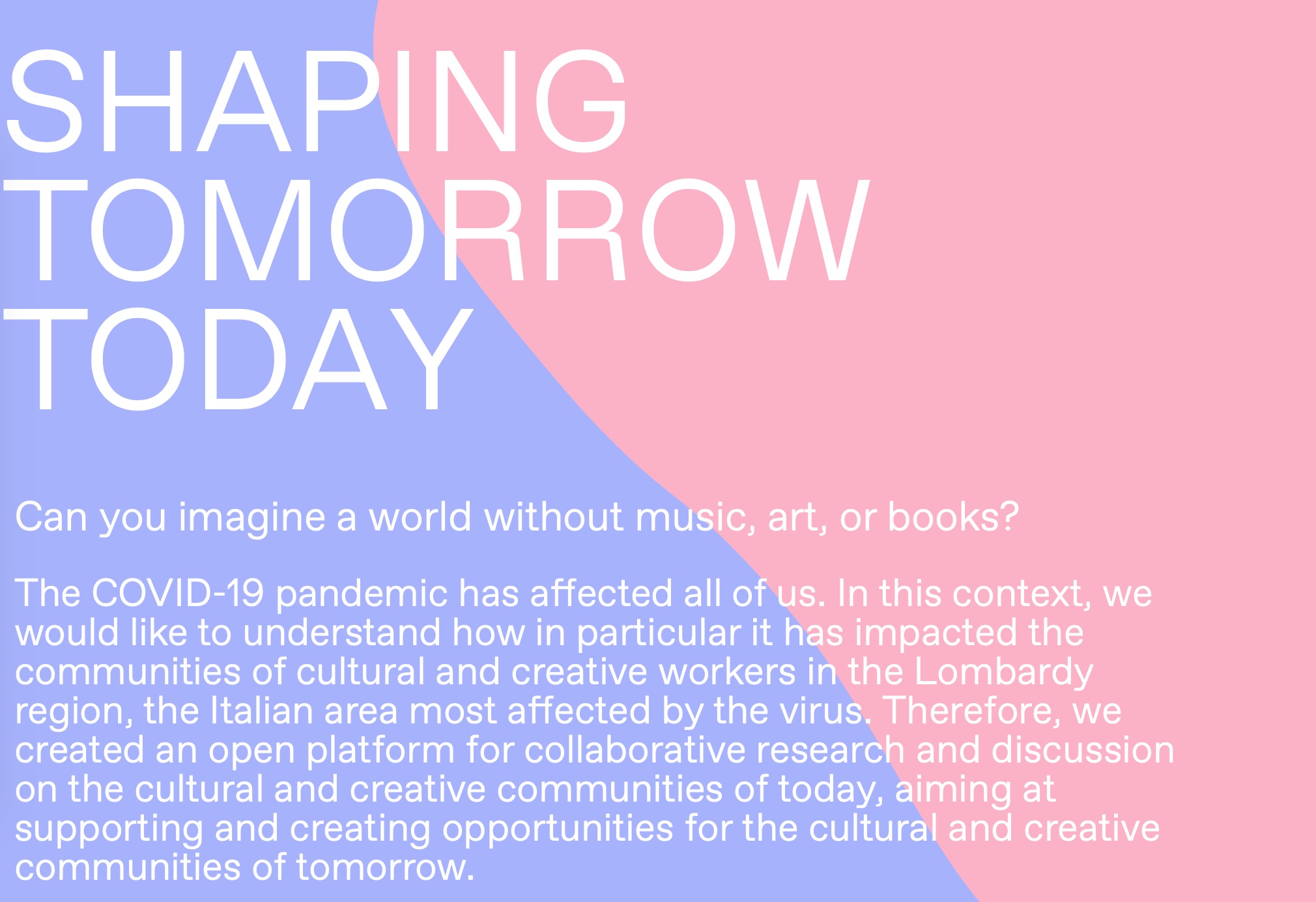 Shaping Tomorrow Today è una piattaforma di ricerca sviluppata in collaborazione con King’s College London e Milano Art Guide, al fine di indagare gli effetti della pandemia di Covid-19 sui lavoratori culturali e creativi operanti in Lombardia, la zona in Italia maggiormente colpita dal virus. L’obiettivo è di dare voce alla comunità culturali al fine di delineare azioni, campagne e proposte concrete che possano contribuire a migliorare il futuro del settore.