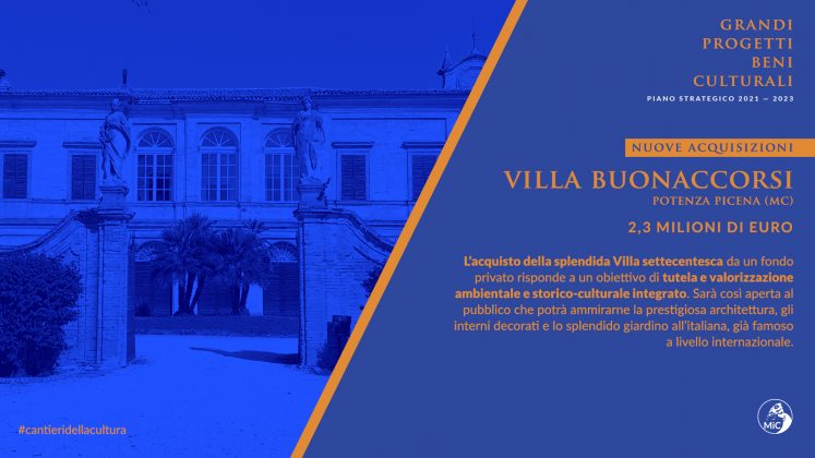 In attesa delle necessarie procedure di verifica di congruità della valutazione delle stime di acquisto da parte dell’Agenzia del Demanio, il ministero ha autorizzato i fondi per le acquisizioni al patrimonio dello stato della Villa Massenzia di Roma, della Villa Buonaccorsi a Potenza Picena e dei terreni agricoli di interesse archeologico in provincia di Venezia.